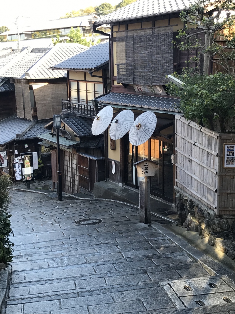 二年坂というと混雑しているイメージでしたが、今回は火曜日の朝に伺ったので観光客がほとんどおらず快適でした。京都らしい風景が楽しめる場所です。料亭やスターバックスなどお店が立ち並んでいます。お散歩すると良いです。