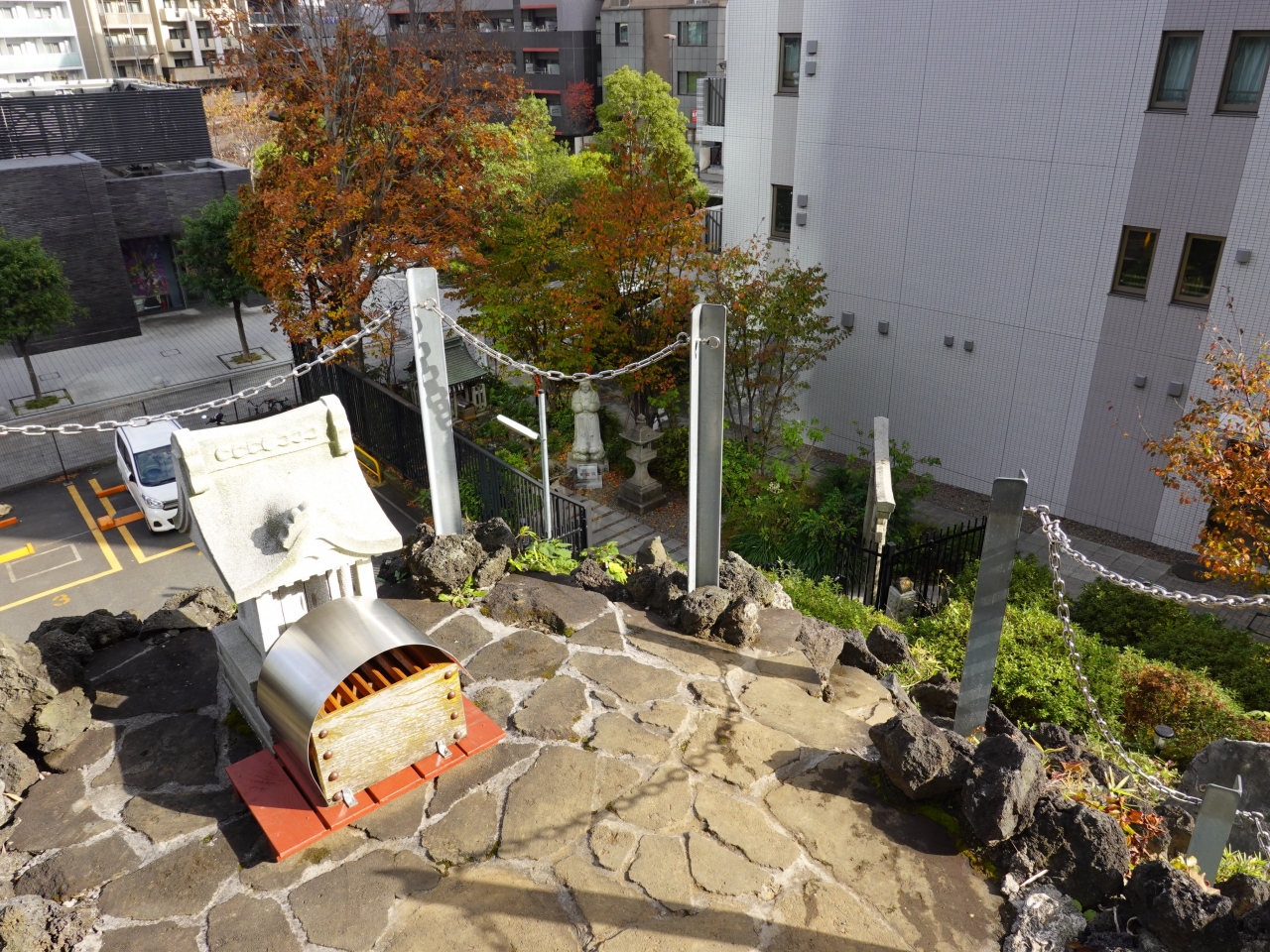 西新宿8丁目にある成子天神社の境内に富士塚があります。案内板によると高さは12メートルと、新宿区内で最大規模ということです。また、この富士塚には富士山の溶岩が使われているそうです。登ってみると、下から見るよりもその高さを実感することが出来ました。