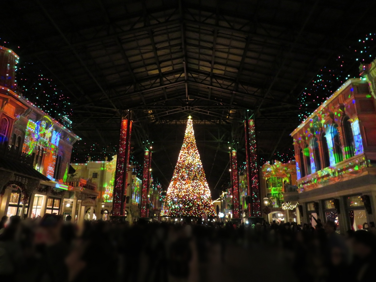 夜になるとワールドバザール全体でクリスマスのプロジェクションマッピングがあり、クリスマスツリーと連動していて、とてもきれいでした。