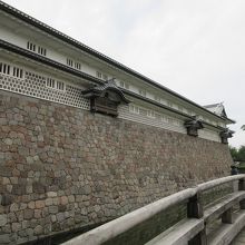 金沢城の芝生を敷き詰めた三の丸庭園の先に堂々とした姿をみえる櫓がこの五十間櫓で、長さが約100mという規模の大きな建築です。最近になって再建された物らしいのですが、古来の工法で再建したことから、太い梁や板張りの床などを含めて、非常に見ごたえがありました。