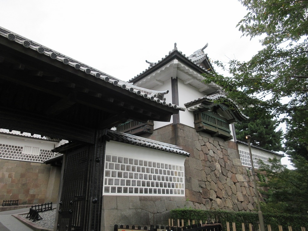 金沢城には,他の城郭ではあまり見かけない海鼠壁が多くありました。壁に平瓦を貼り、その隙間を漆喰で固めたもので、防火の面で非常に効果があったそうです。斜めではなく横方向にレンガを積むように並べて張ってあり、非常に美しいと感じました。石川門をはじめ、五十間櫓など、どれも非常に見ごたえのあるなまこ壁でした。