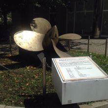 日本丸のメインマスト用トップゲルンマストの正面、中庭のような所にあります。日本丸のスクリューとのことですが帆船なのにスクリューがあるんだとちょっと意外でした。昔から風が無い場合どうやって進むんだろうと漠然と思っていたので何となく答えを得た感じです。直径が2メートル程で重さは900キロ、これが左右に二つ付いているそうです。