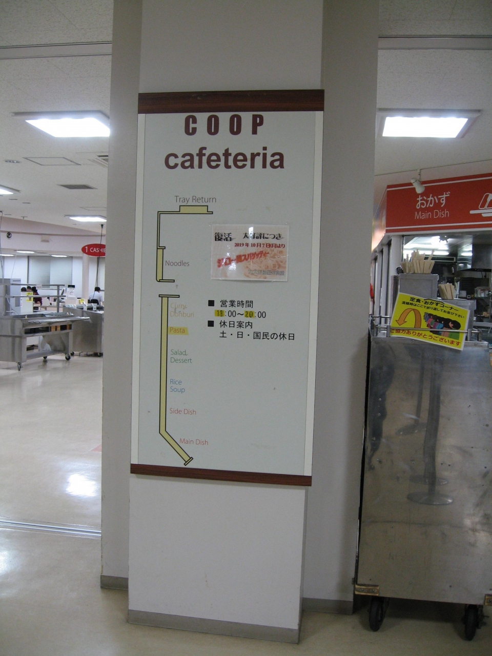 正面からは入りにくいし、正面右横に階段がありそこを登っていくと学食に直に入れます。