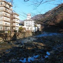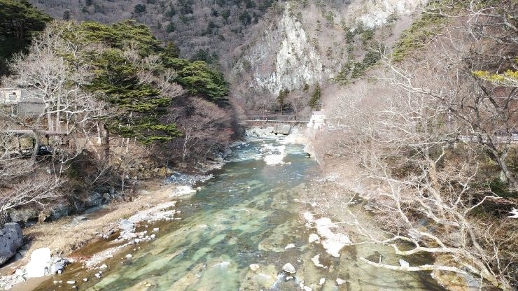 広い範囲に分布する塩原温泉に沿って流れる箒川。