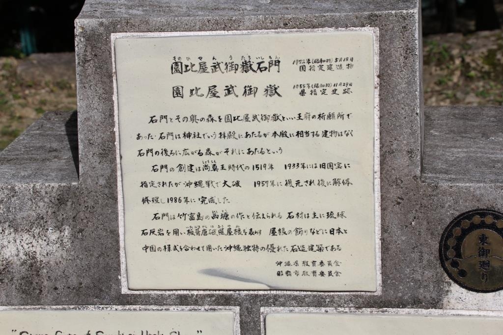 「石門とその奥の森を園比屋武御嶽といい王府の祈願所であった。石門は神社で言う拝殿に当たるが本殿に相当する建物はなく、石門の後ろに広がる森がそれにあたるという」以下省略。