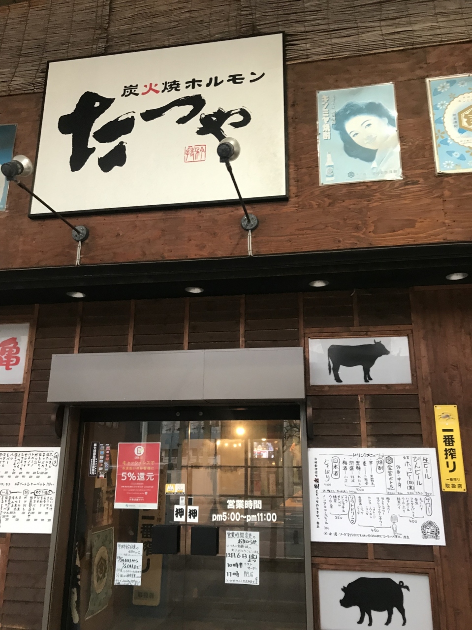 JR秋田駅から歩いてすぐの商店街にある、炭火焼きホルモンのたつやさんです。青森旅行中でしたが、ホルモンが食べたくなりらいてんです。炭火焼きなので、ホルモンの脂も香ばしく焼かれていくらでも食べれちゃいます。