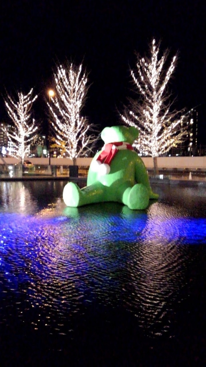 JR大阪駅とグランフロント大阪の南館が隣接する建物前の広場が『うめきた広場』でグリーンのでっかいくまさんが目印です。大阪から浜松までウィラーバスを利用することが多いので、ウィラーバスの乗り場までいつもこの広場を通ります。朝は日の光りでグリーンが更に鮮やかな色に見えますし夜はライトアップされていて、とてもキレイでした。このくまさんの名前は『テッド・イベール』というそうで愛称は『coool』だそうです。確かに『カッコいい』ですが。