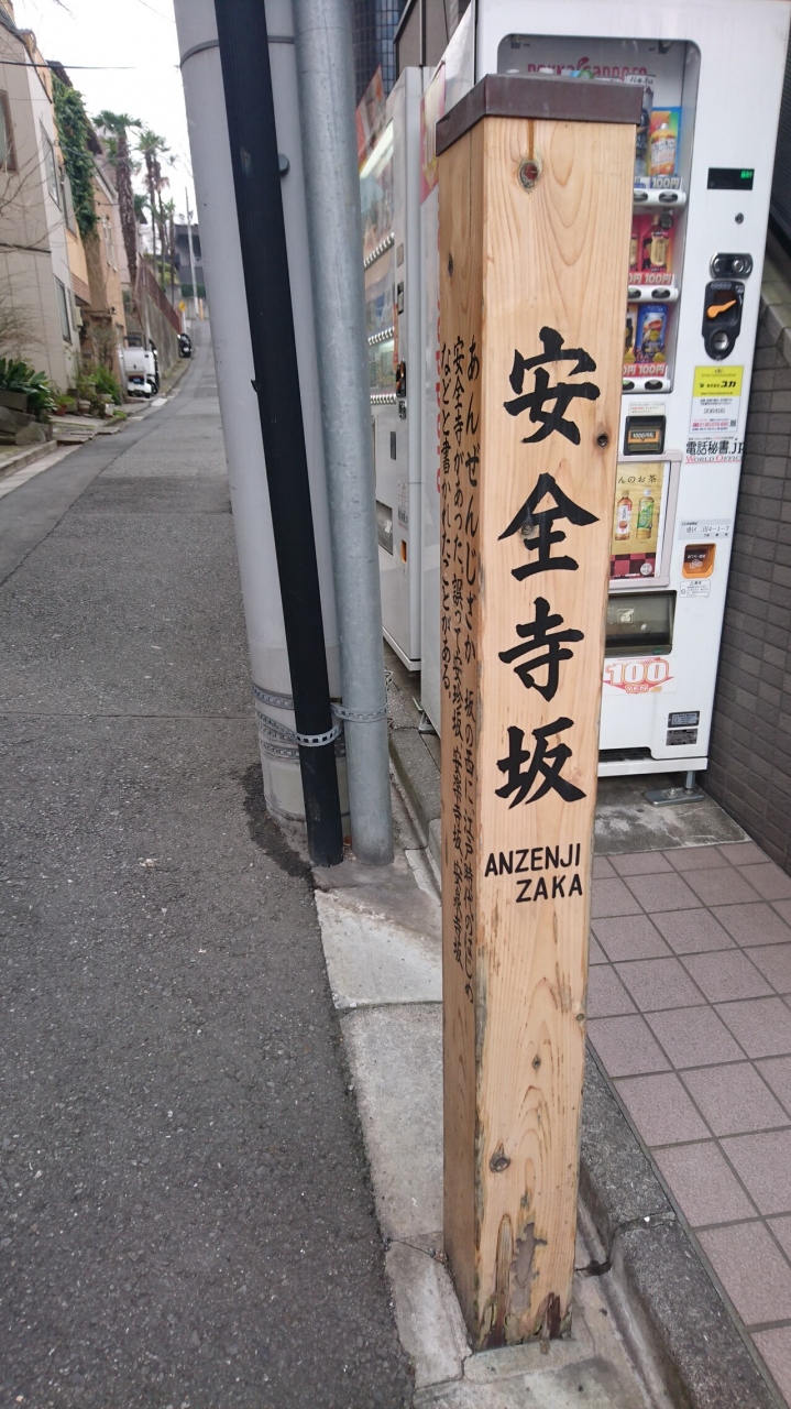 慶応大学三田キャンパスの南側を通る桜田通りからさらに南に上っていく細い坂道が安全寺坂でした。かつてこのあたりに安全寺があったことからこの名前がついたそうです。すごく細い道ですが、上っていくと塩見坂や蛇坂へとつながっていました。