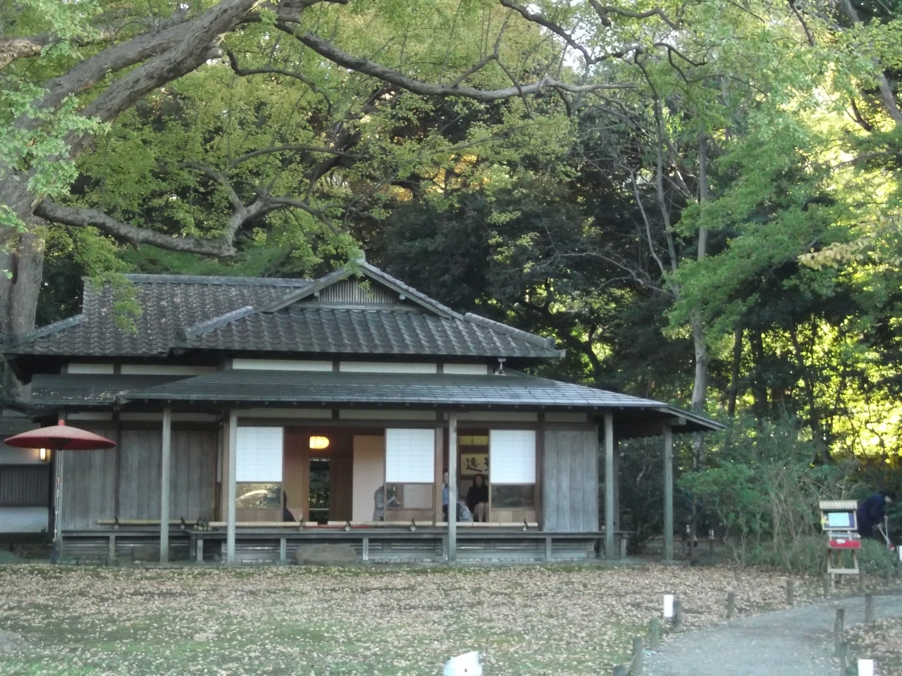 六義園の正門からから入り、内庭大門を通らずに裏道を進んでいくと大泉水に出る手前にこの建物があります。和風の古民家風の建物で、有料で利用できる施設として使用されています。お休み処にもなっていて、和菓子と抹茶をいただきながら一服できるところです。