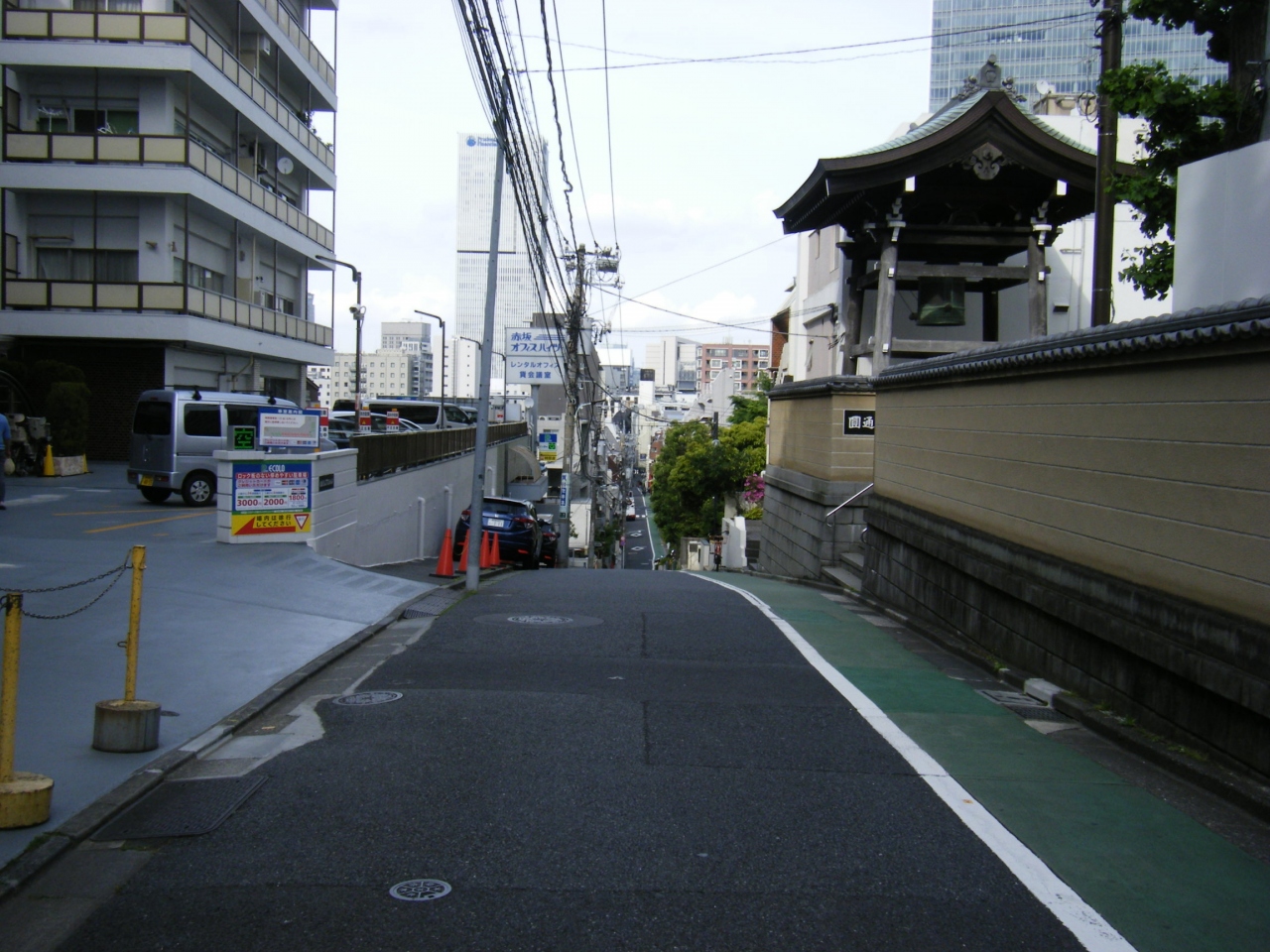 東京赤坂のTBSテレビの裏手にある坂道の一つで、通り沿いには坂道の名前の由来となった日蓮宗の円通寺もあります。円通寺の目の前から急な坂道となっており、ジェットコースターみたいな景色でした。通り自体は道幅も狭く、あまり観光目的で来るような場所ではないかもしれませんね。いい運動にはなると思いますが。