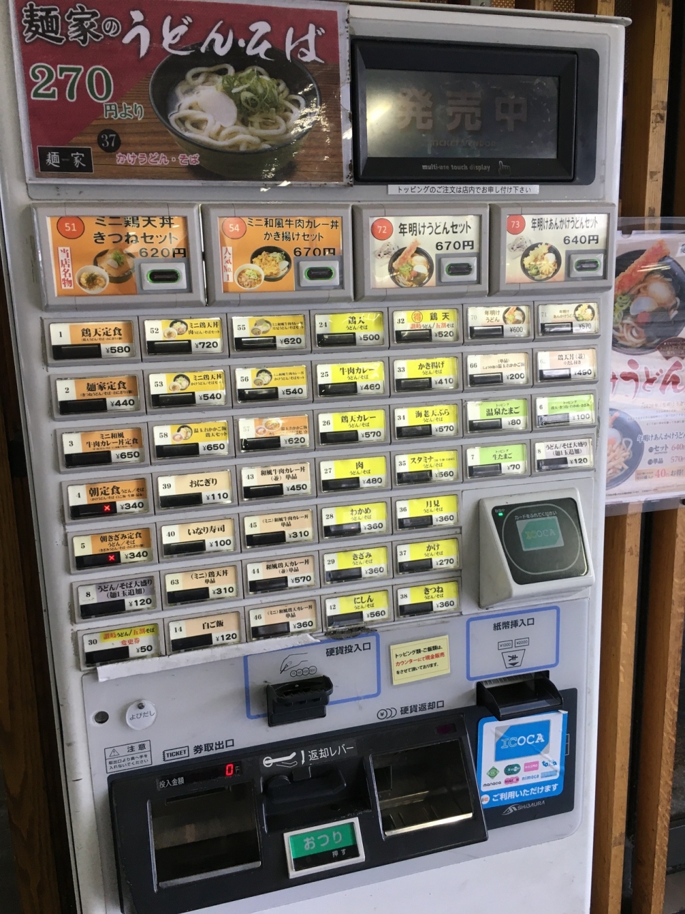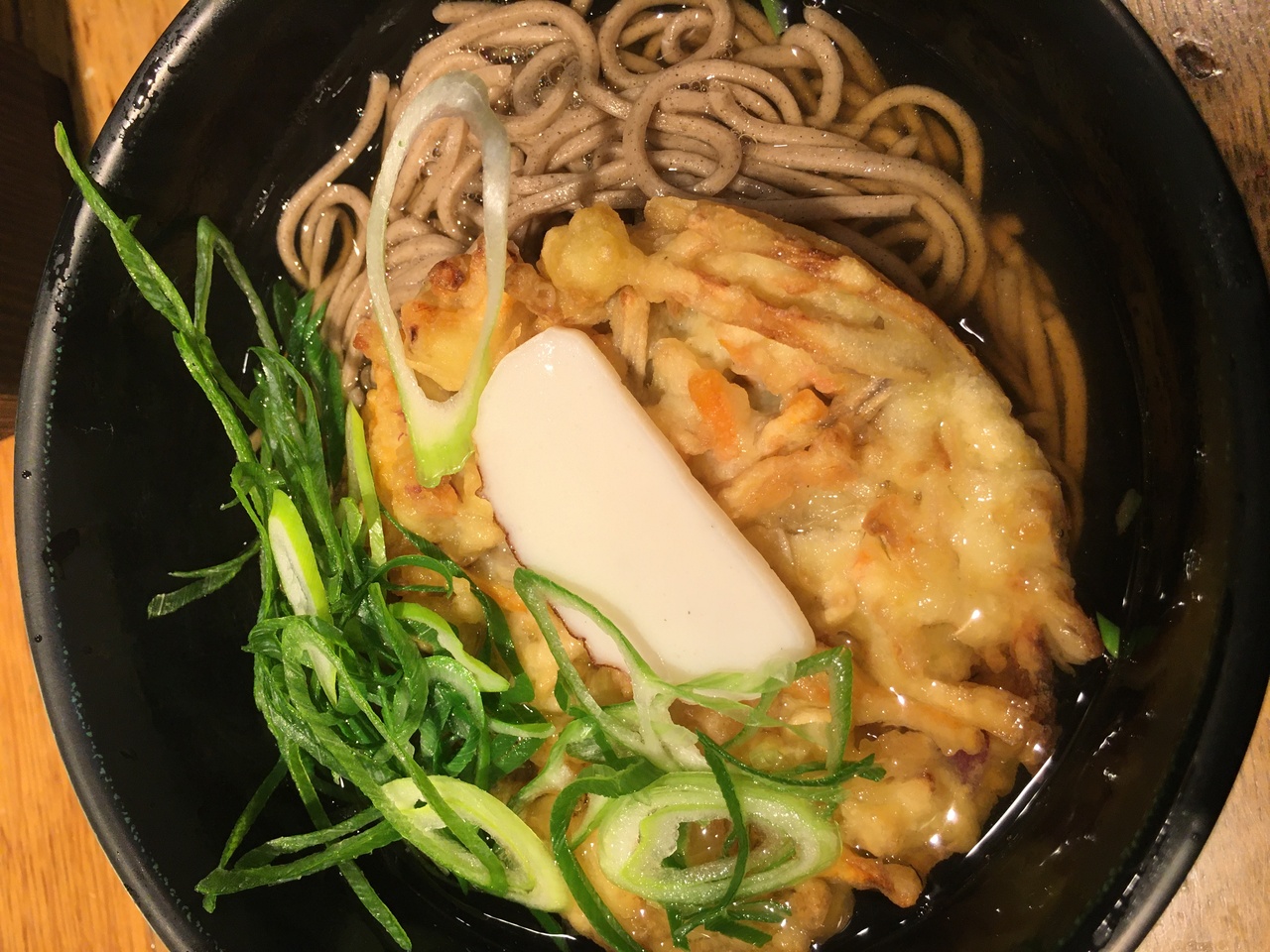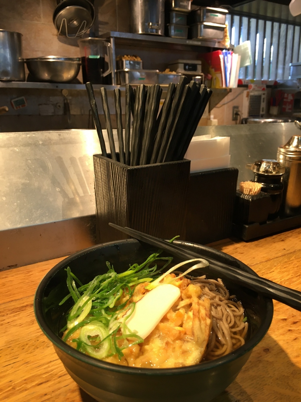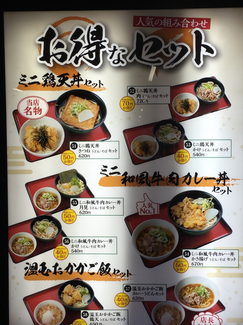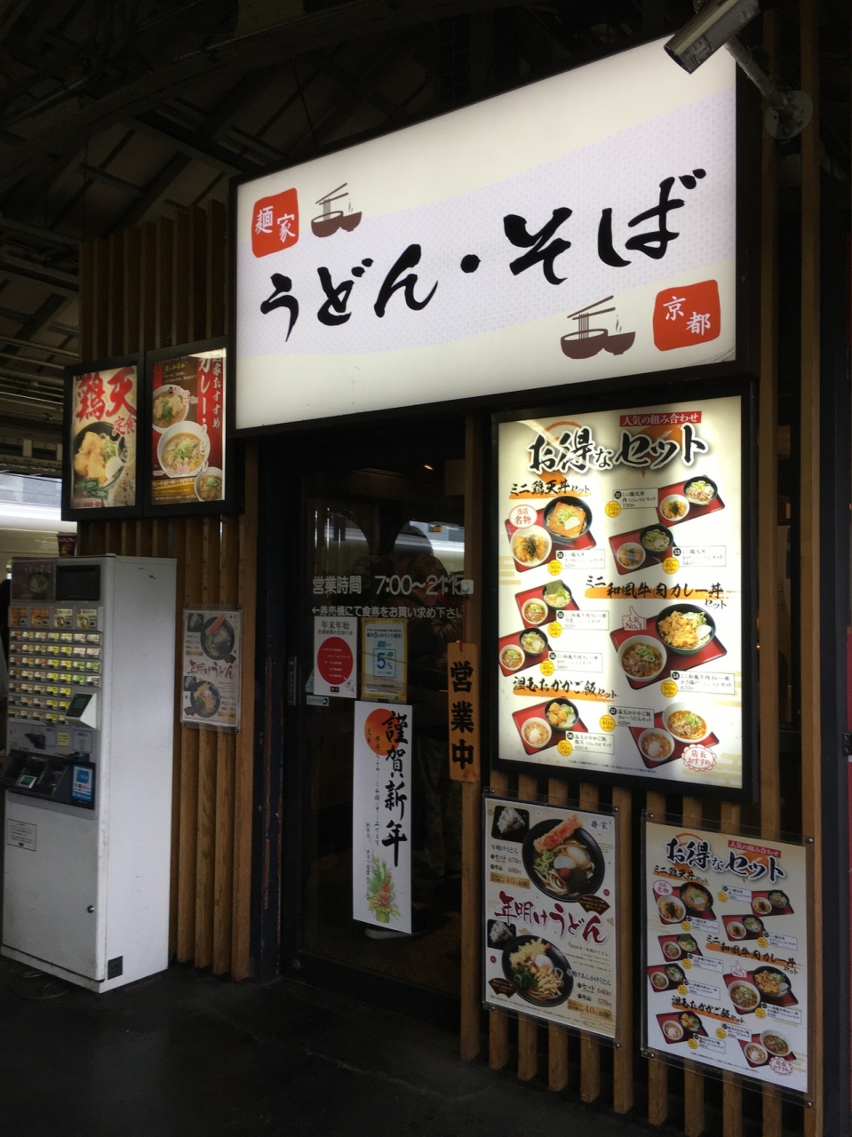 JR京都駅構内の、2.3番手線ホームにあり、自動食券が店外に、横には写真でメニューが貼ってありセットものもありました。常に混んでいる立ち食いカウンター専門店で、かき揚げ蕎麦のそばはすこし麺が伸びているようなそばでした。店員さんがテキパキしていて、列車の待ち時間に利用出来ます。