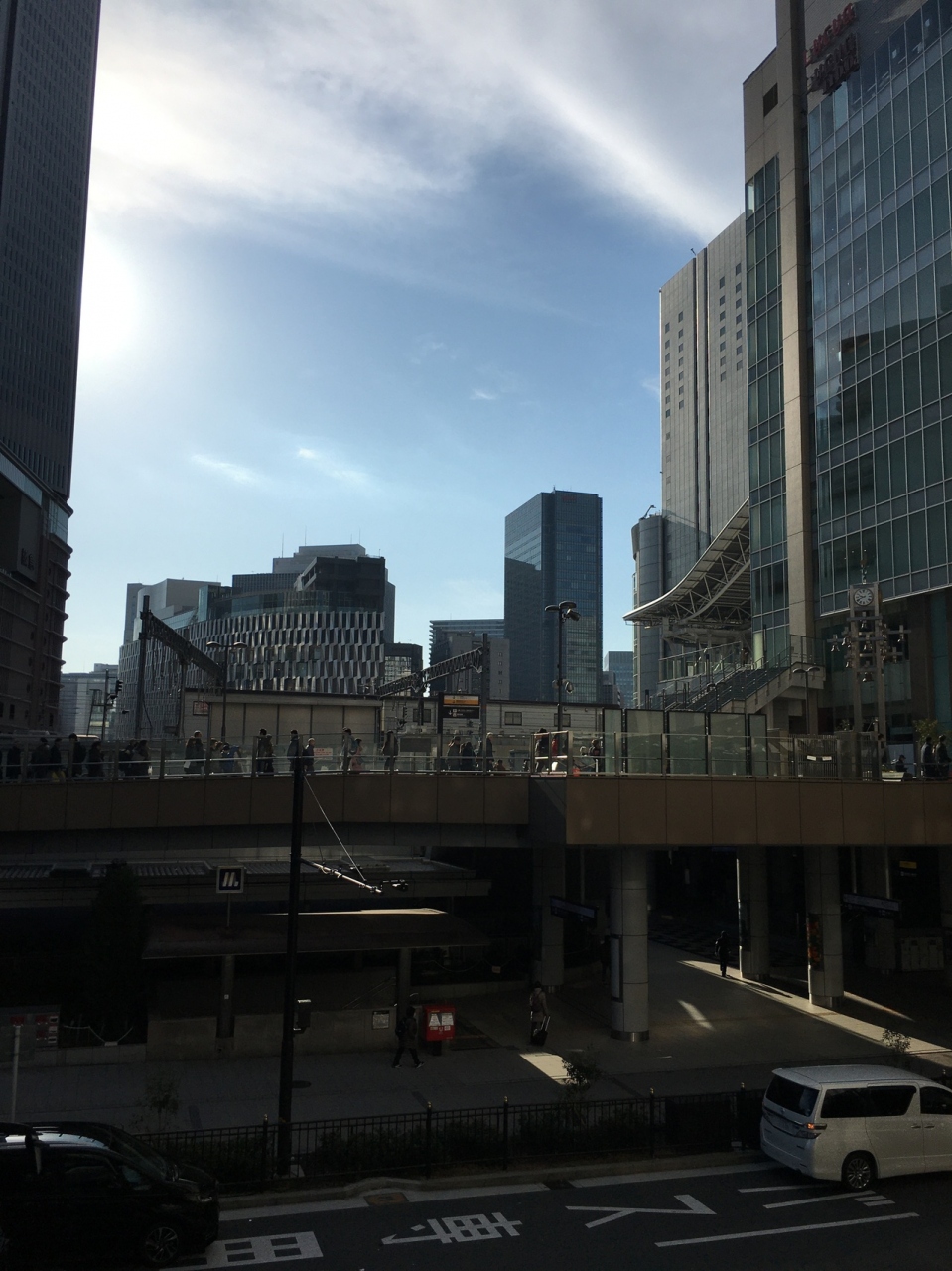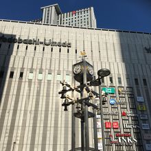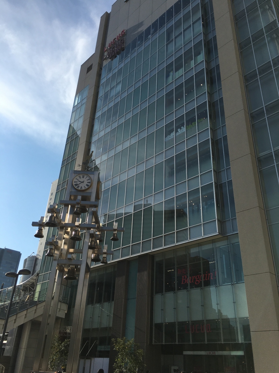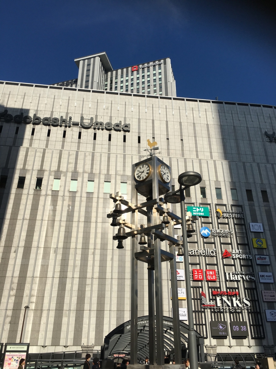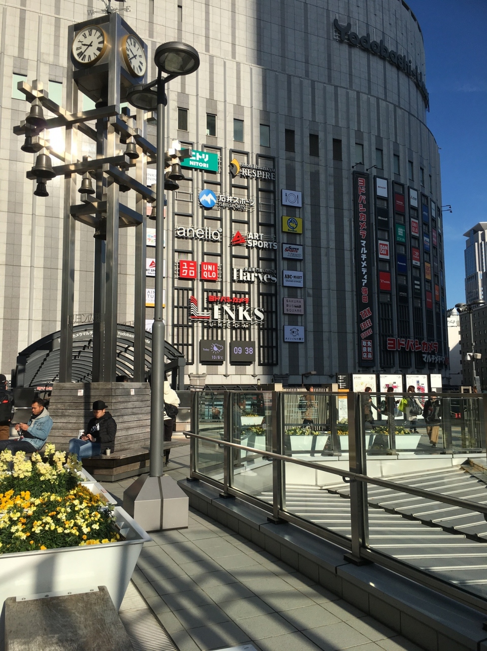 待ち合わせには利用される場所で、阪急の大阪梅田駅とJR大阪駅を結んでいて地上にあり、ベンチや時計があります。鐘がいくつかあり、鐘の鳴っているのは聞いたことがないですが、鐘が時間ごとになるのかもしれません。地上なので雨の日は難点な場所です。