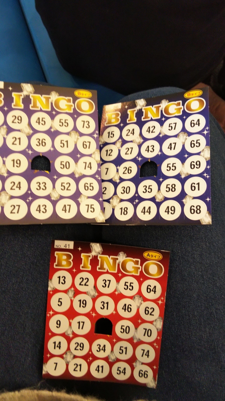 1枚300円のビンゴカードを3枚づつ買って挑んだんですが、見事撃沈でした。200人以上いたかも。