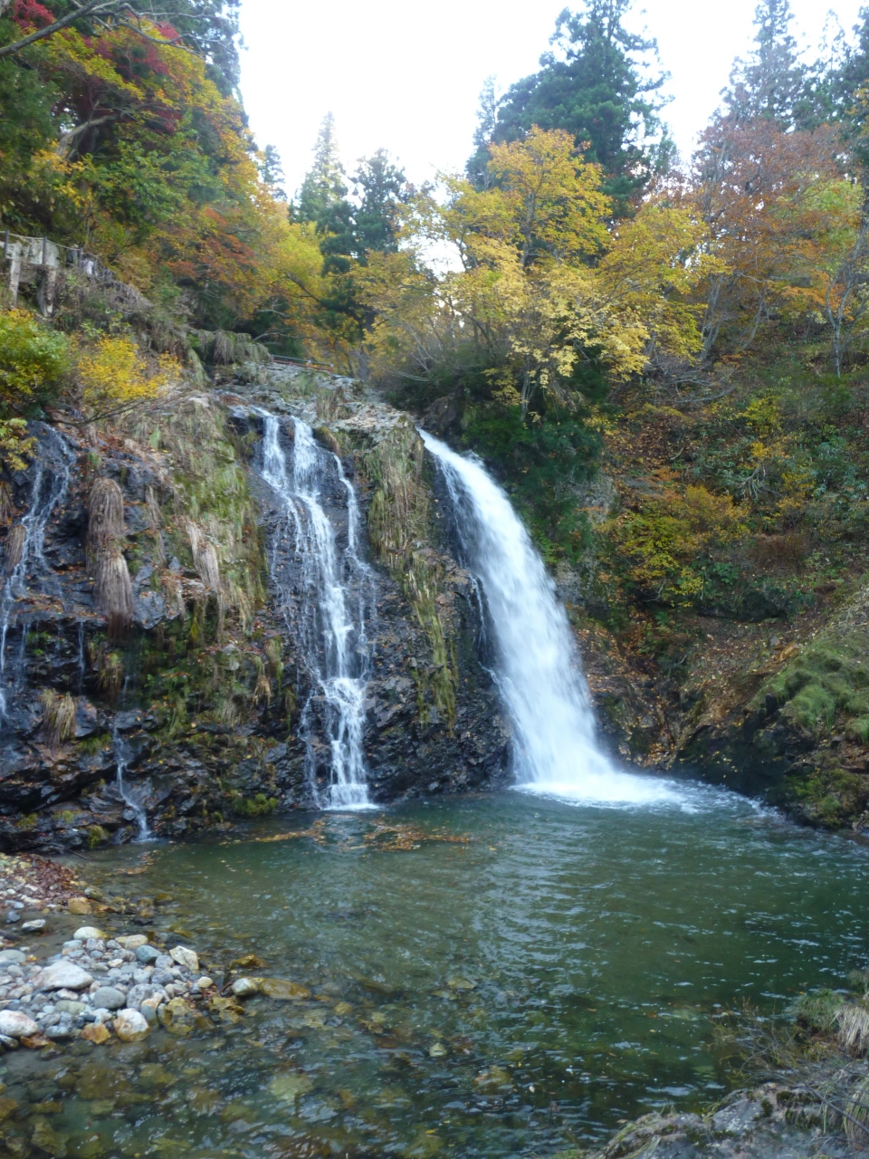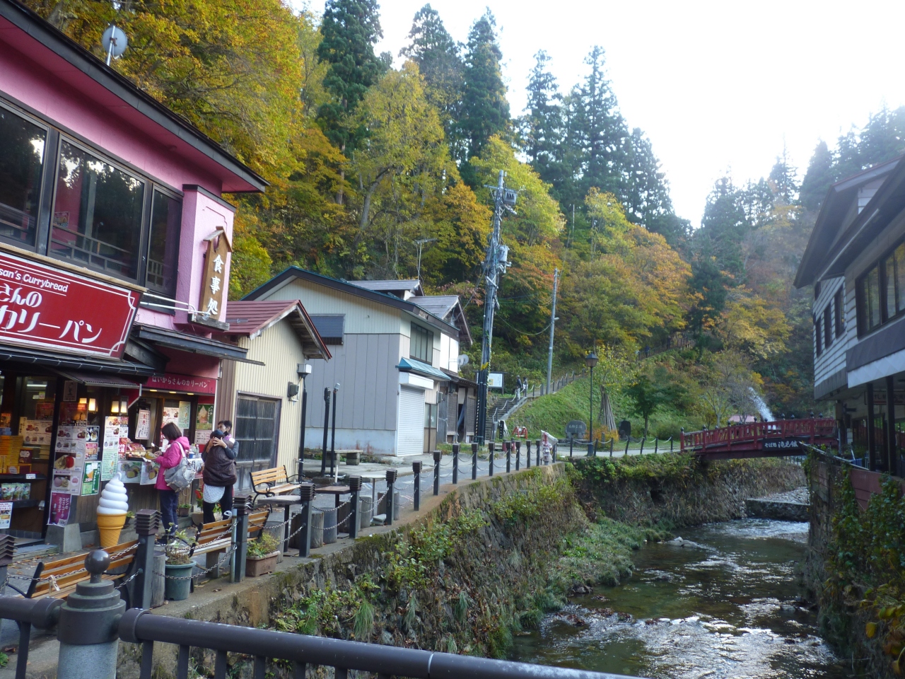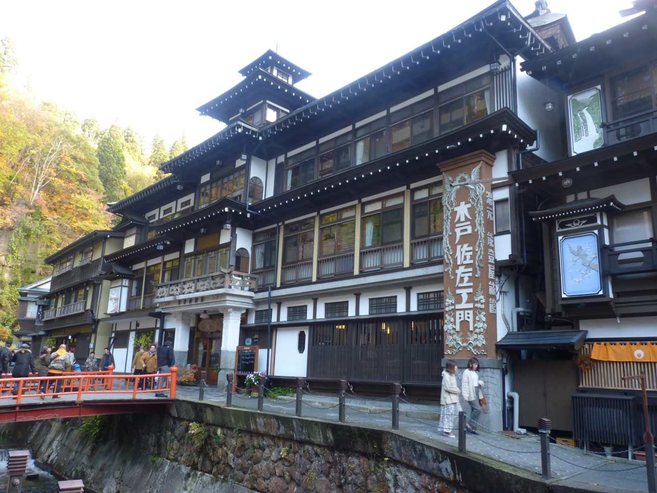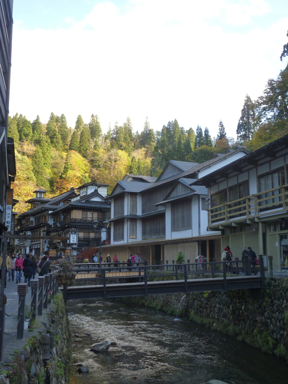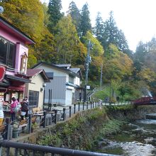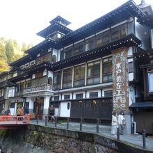 バス停より徒歩で10分近く下り坂を下りてゆくと川に挟まれた銀山温泉の旅館街が見えてくる。山の黄葉はいま少し早いようだが、色づき始めて雰囲気を醸しだしている。入り口から白金橋までが約10分ほど、一番奥にある白金の滝までは10分ほどで行ける。見所はほぼ中央に佇む能登屋でその趣はまさに大正ロマン一杯!