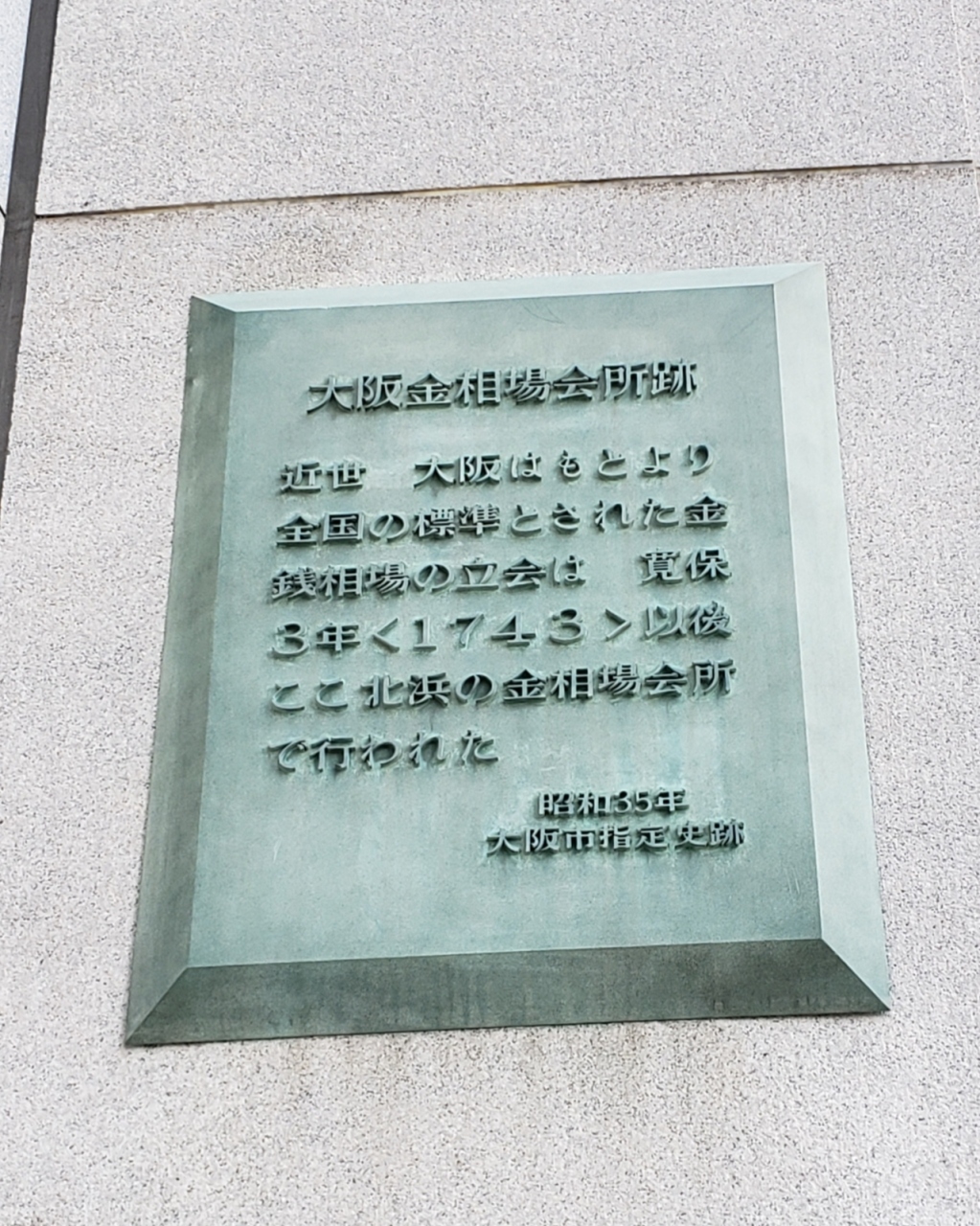 大阪北浜駅からすぐの大阪取引所の壁(北浜レトロビルヂング側)にはめ込まれている小さなプレートです。