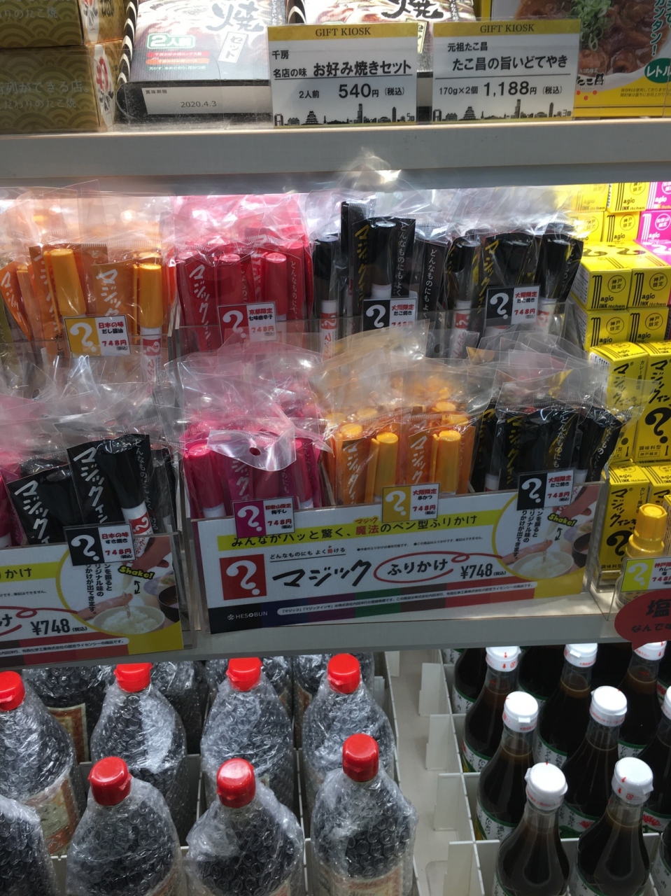新大阪の構内にある大型店舗です。すぐそばにもキヨスクの店舗ありますが品数を求めるならギフトキヨスクがオススメ。マジックふりかけと言う珍しいお土産を買いました。ペンタイプのリアルなかたちのふりかけです。たこ焼き、イカ焼き等の冷凍品も売っています。