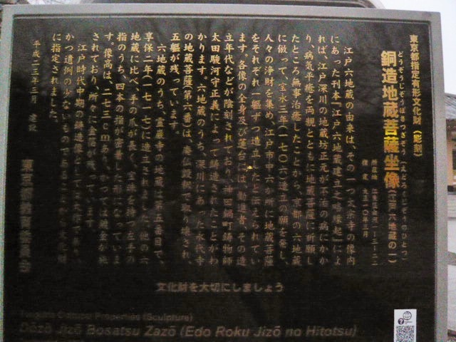 銅造地蔵菩薩坐像の傍には、東京都教育委員会の解説板があります。