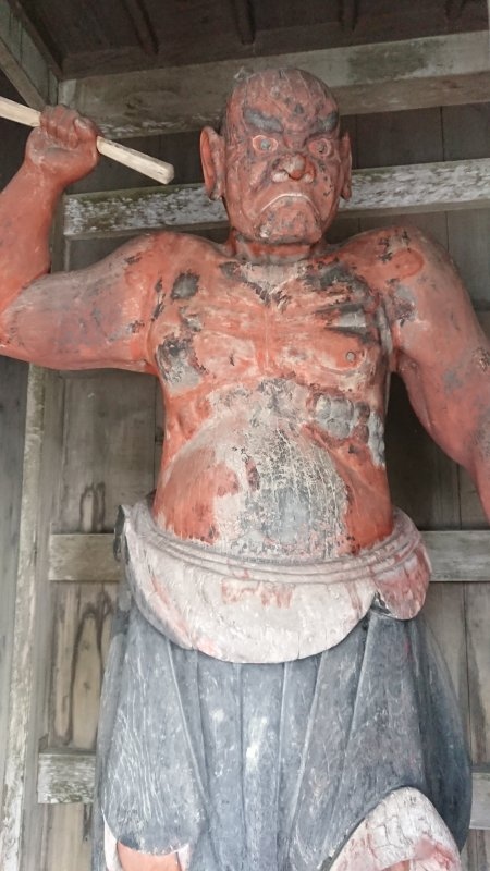 駐車場から遠めに見ても赤味がかった瓦屋根のアートを感じながら近づいて行くと、両脇に仁王像が立ちはだかっていました。満身創痍とも思えるその身体と共に、迫力のある形相。隙間からスマホのカメラで覗き込むように撮影することに気がひけながらも、写真として収めたかったです。