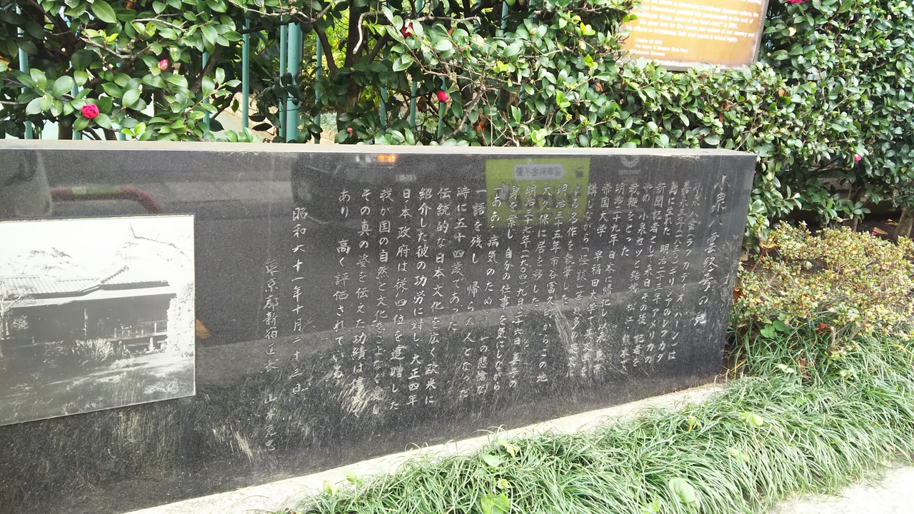 文学者小泉八雲の終焉の場所ということですが、横長の石碑で、小泉八雲の活躍と共に亡くなられた場所だということが記されています。はじめて小泉八雲を知る人もだいたいのことがわかる分りやすい石碑だと思いました。