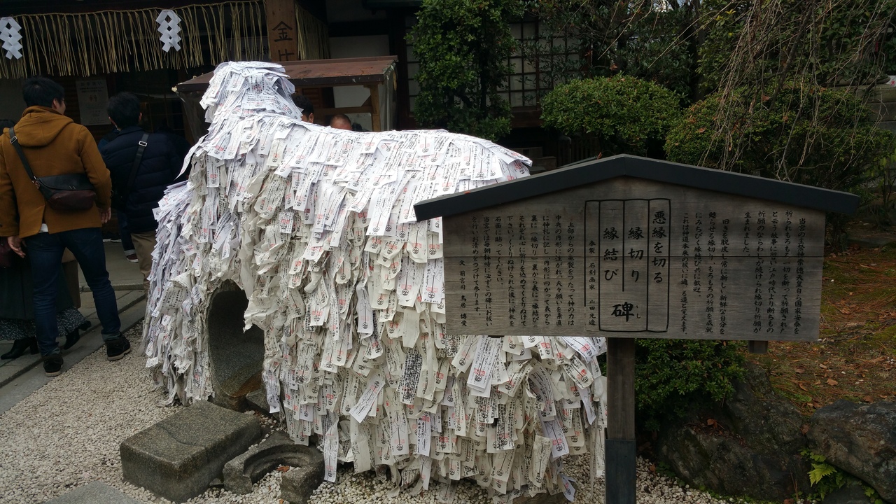 これは「縁切り縁結び碑」で、穴の空いた巨石を表からくぐって悪縁を切り、裏から再度くぐって良縁を結び、願いを書いた形代を巨石に貼って祈願します。