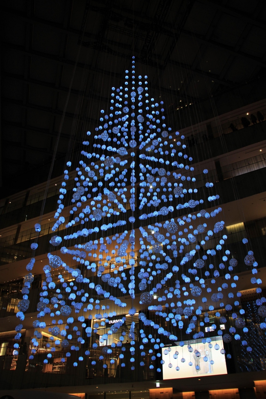 世界と日本、人と人、心と心を「むすぶ」というKITTEの想いを表す、一つひとつ、職人の手によって編まれた高さ16mを超える水引のクリスマスツリーが、30分ごとにJ-WAVEが選曲したクリスマスソングに合わせて美しく輝きます。