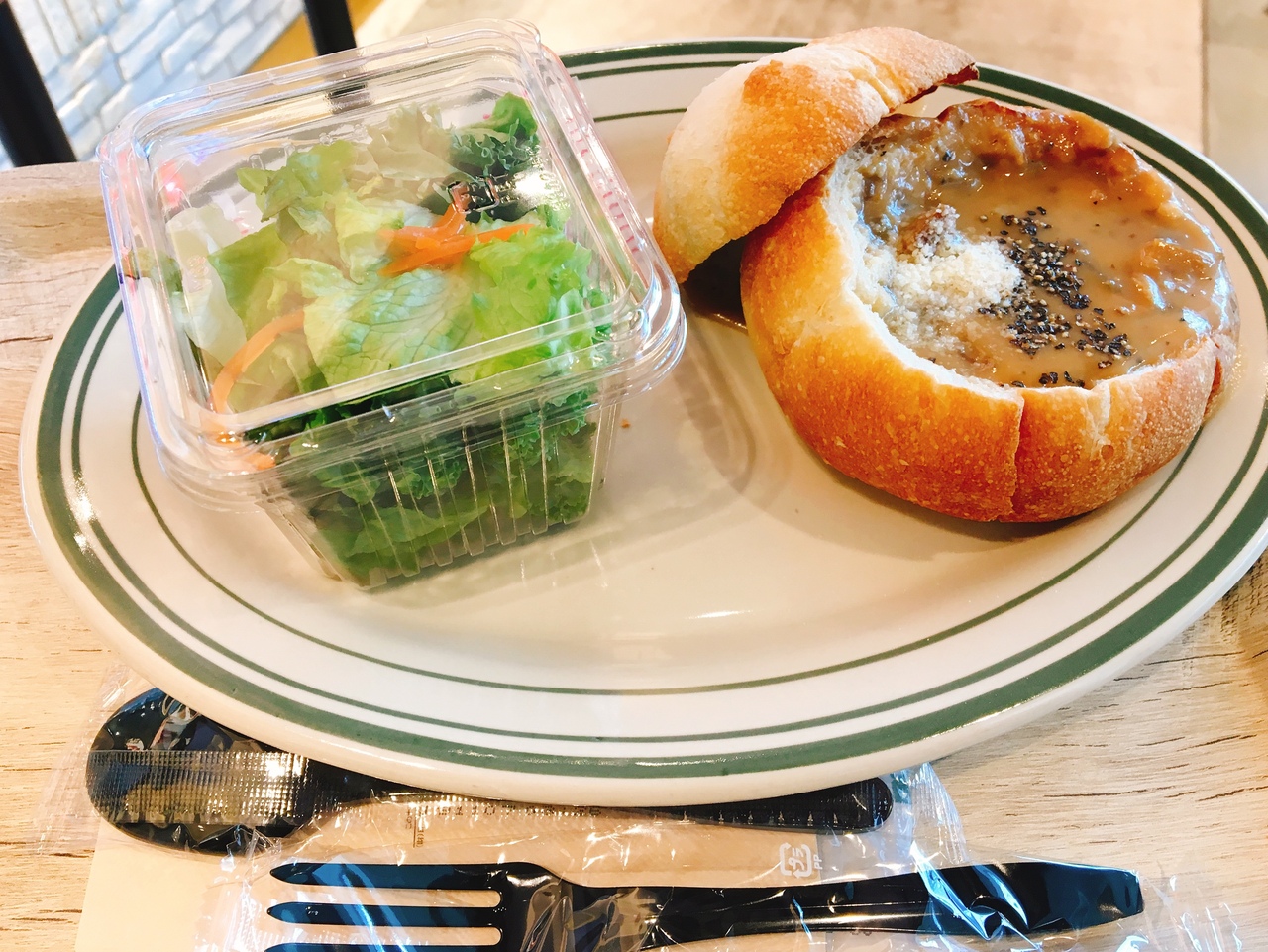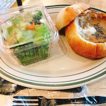 写真の通りくり抜いたパンの中にスープかシチューが入る。容量の関係で量的には普通のスープセットよりちょっとスープ少なめ。サラダはごく普通。