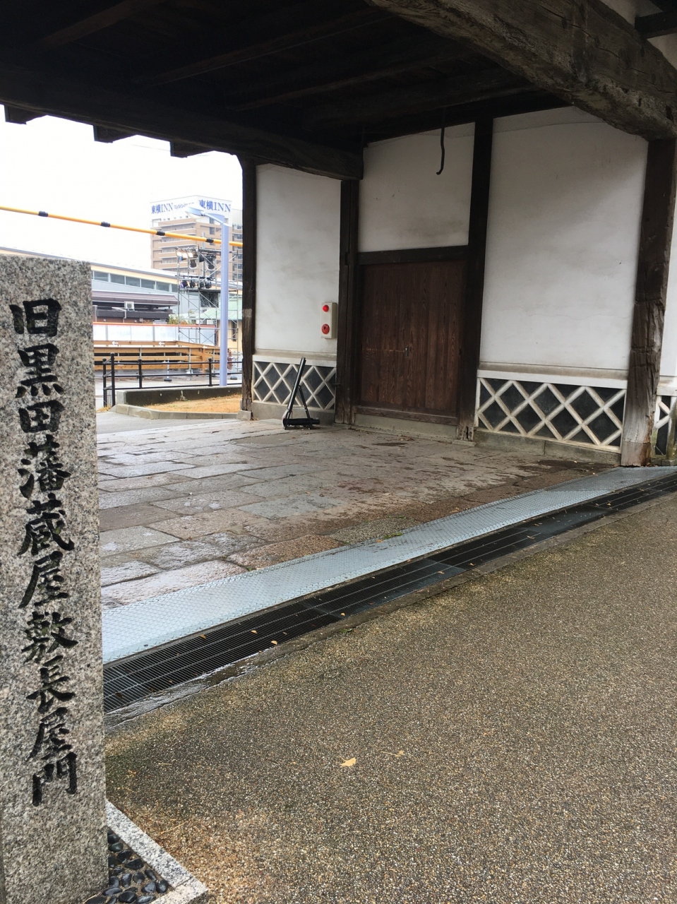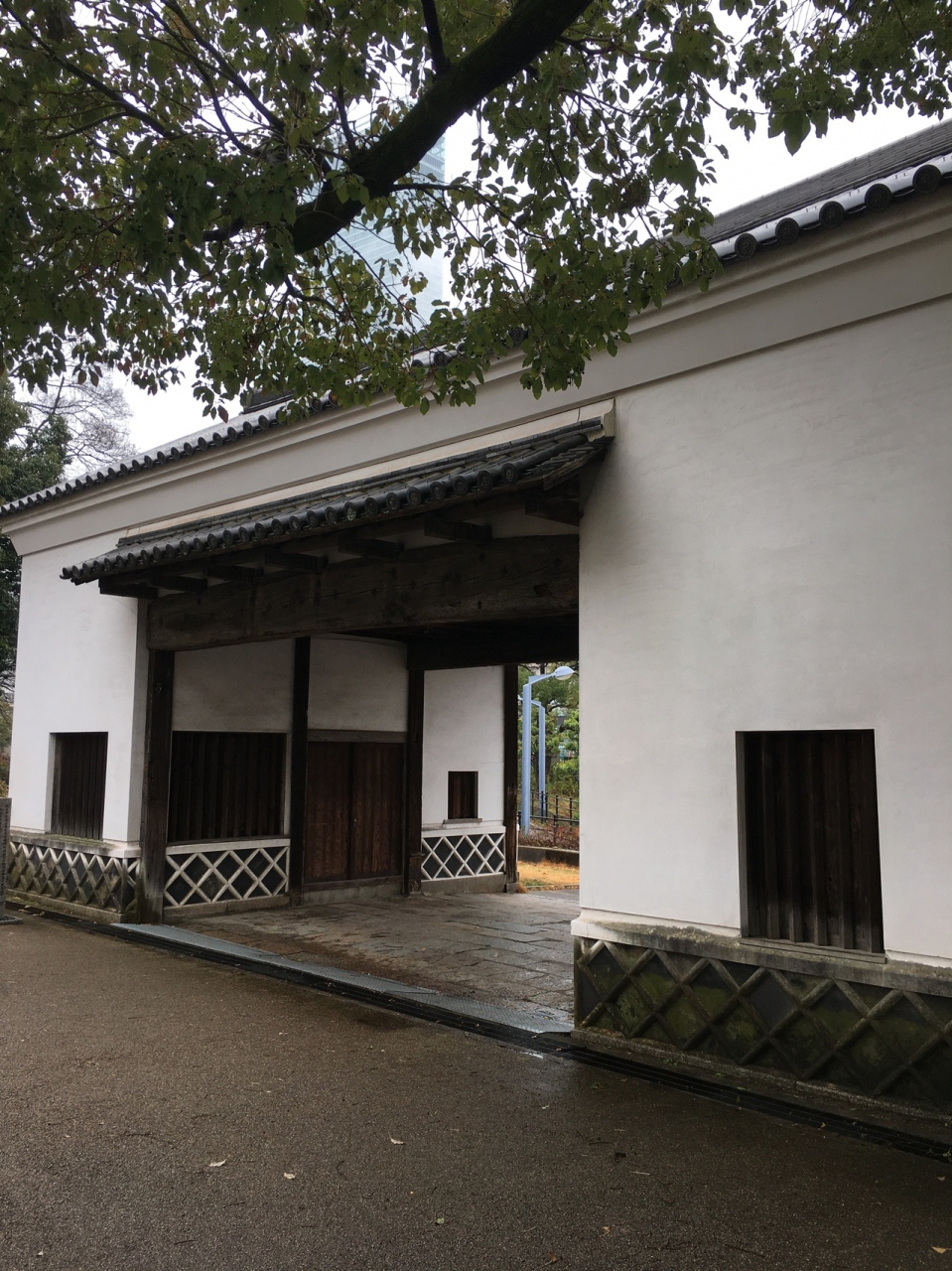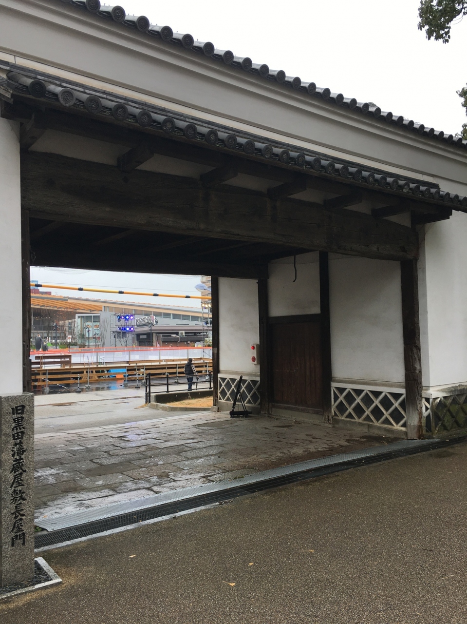 門だけがあるので少し間が抜けた雰囲気でしたが、白い色の門で上部は瓦屋根でした。門の中を潜ることが出来ます。門内を見上げると古い木で作られているのがわかります。真四角の形で周りが近代的な建物のせいか少し違和感がありました。
