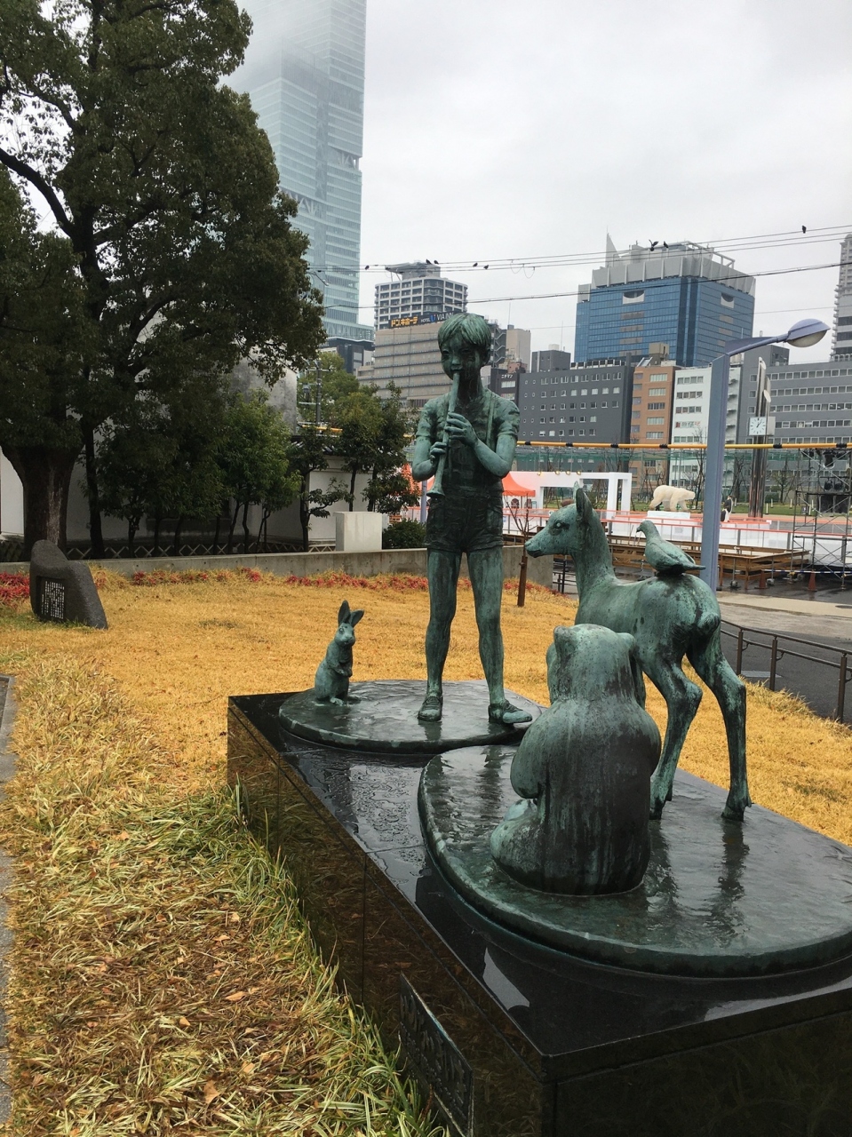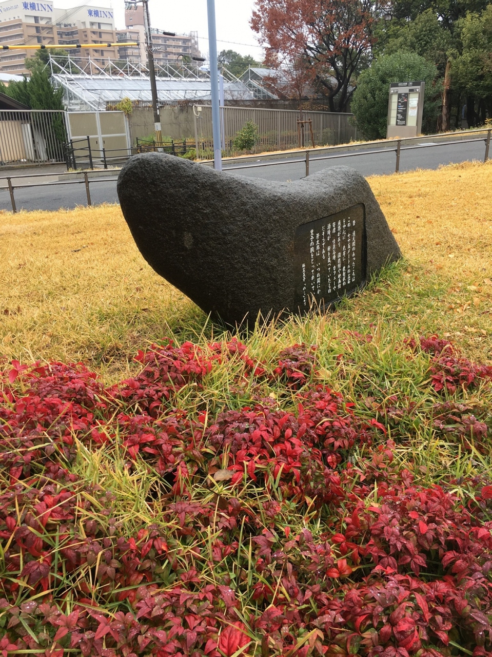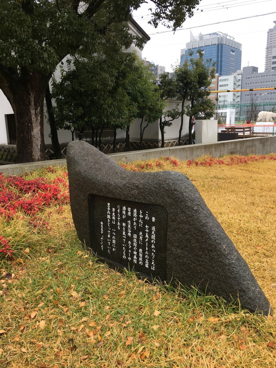 文学者なのでしょうか、この人物は知らなかったですが通天閣のことが書かれた、めしと言う本の歌碑がありました。黒色の石に文字は白い文字で書かれています。周辺を囲いで囲み、1メートル程の距離からの見学になります。
