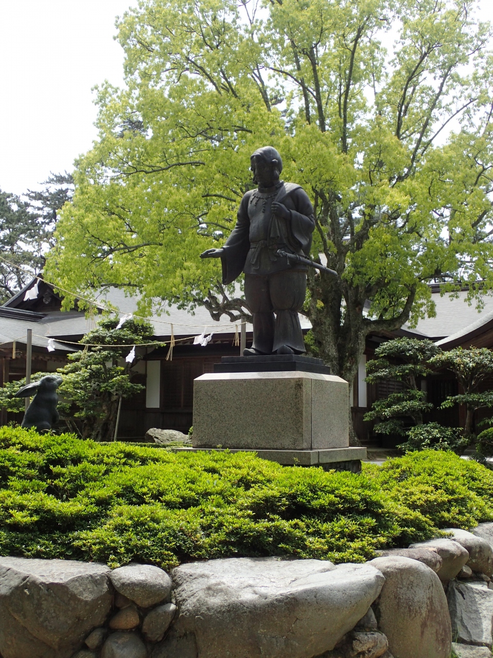 大国主大神と因幡の白うさぎの像で、大国主大神はうさぎに手を差し伸べるような感じで見つめて、うさぎも下から大国主大神を見上げていました。参道を挟んで反対側には対になるようにムスビのご神像がありました。