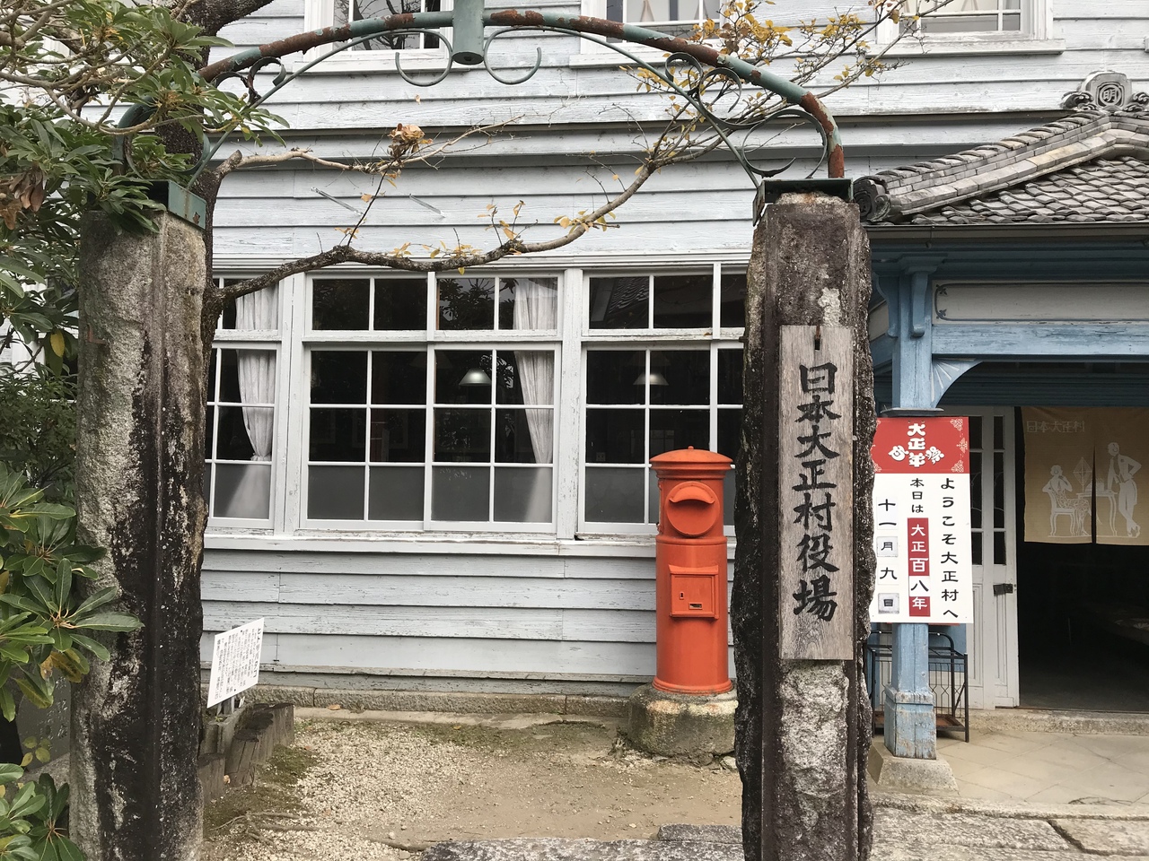 入口に日本大正村役場の表札、訪問日の日付が大正108年11月9日と看板が掲げられていて、横には赤い郵便ポストがあった。ドラマや映画で見る時代の趣きを感じる面白さがあった。