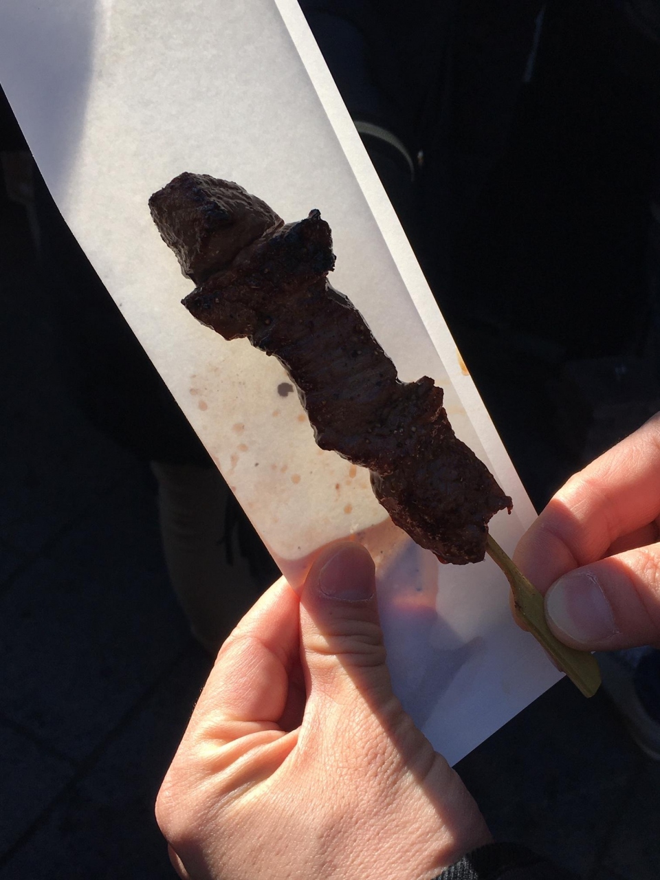 1串800円ほどする松坂牛のお肉を注文しましたが、食感はぱさっとした感じで、味も普通でした。ランクはいろいろありますが、わりと高めのものでも、普通だと感じました。支払いは現金のみとなります。