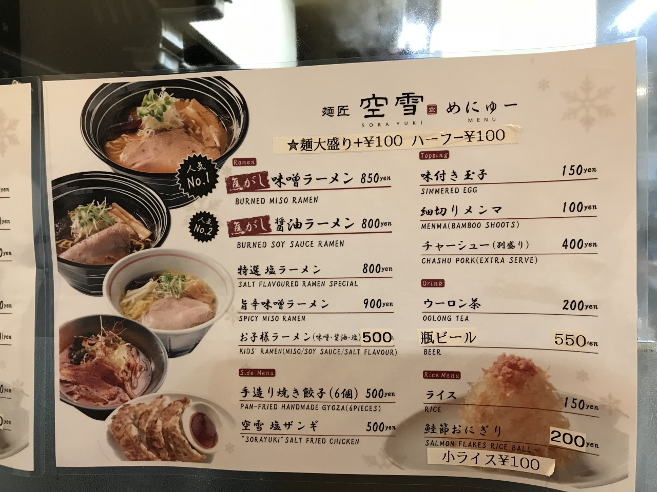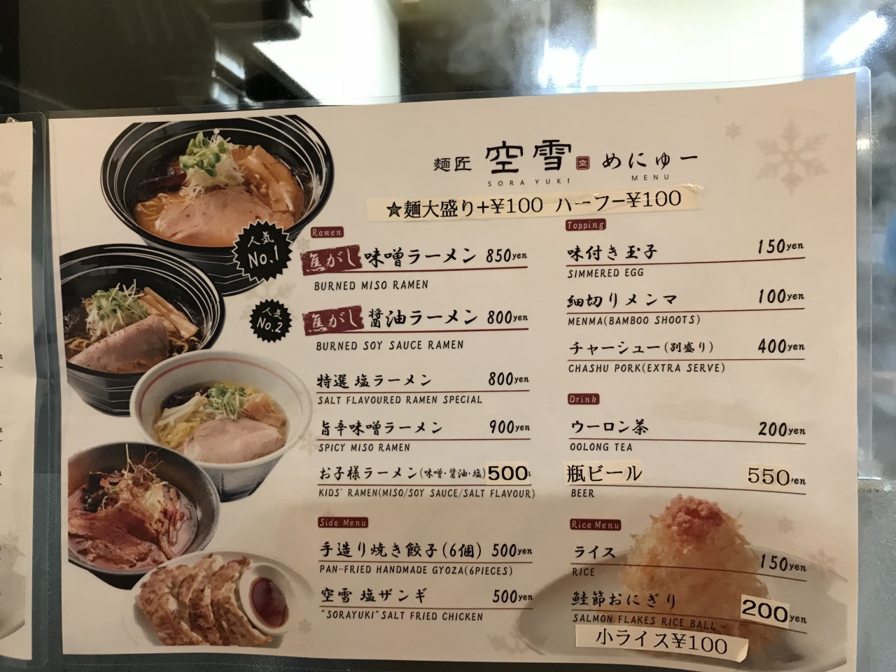 私はno1の味噌ラーメン、主人は、塩ラーメン、娘はno2の焦がし醤油ラーメンを注文しました。