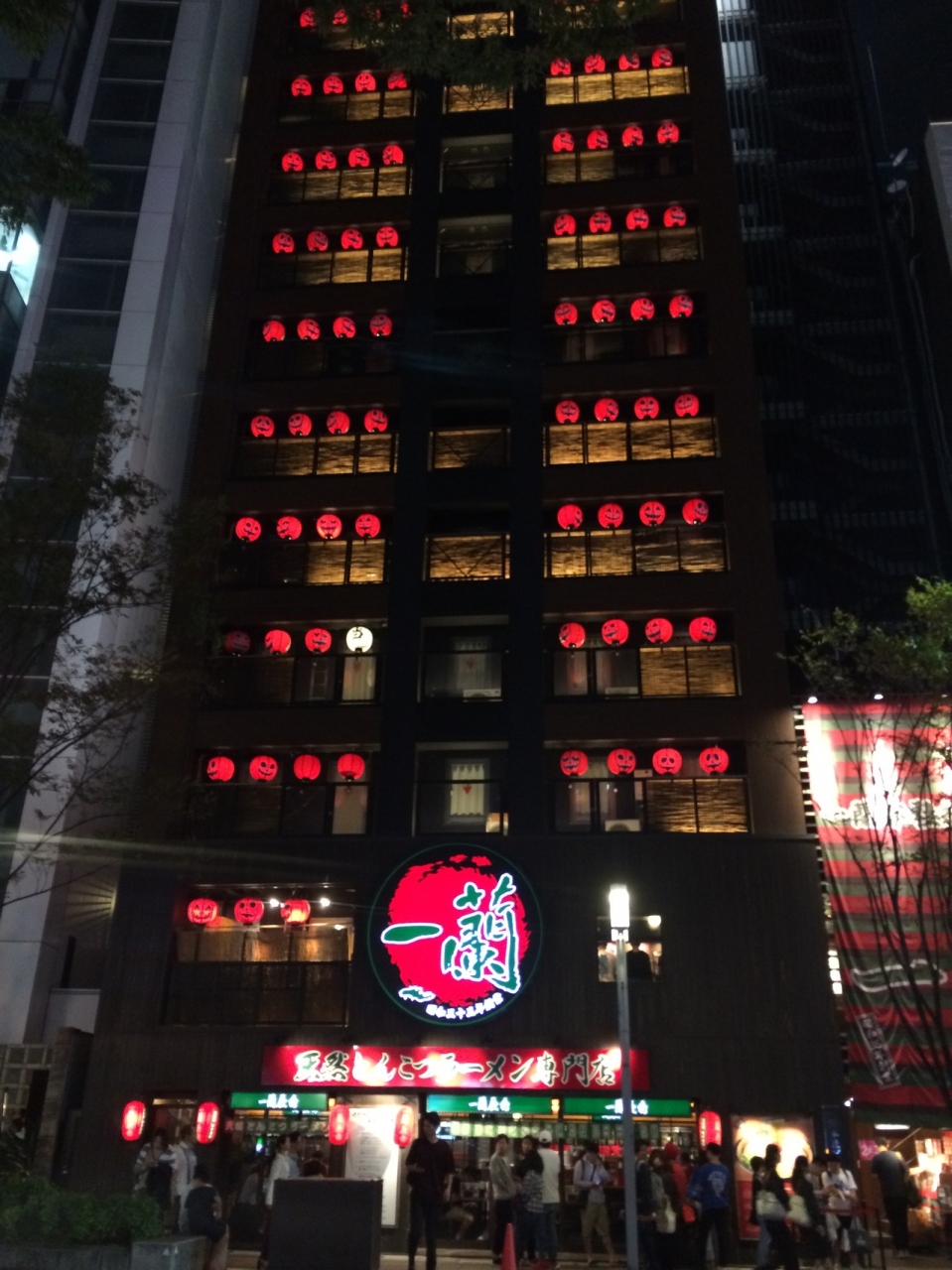 一蘭の赤い提灯がたくさんぶら下がっている大きなビルなので、一目で一蘭のビルだと分かります。夜は、赤い提灯がめちゃくちゃ映えます。今では海外でも見かける一蘭の本社で食べるのは新鮮でした。2階までがお店です。