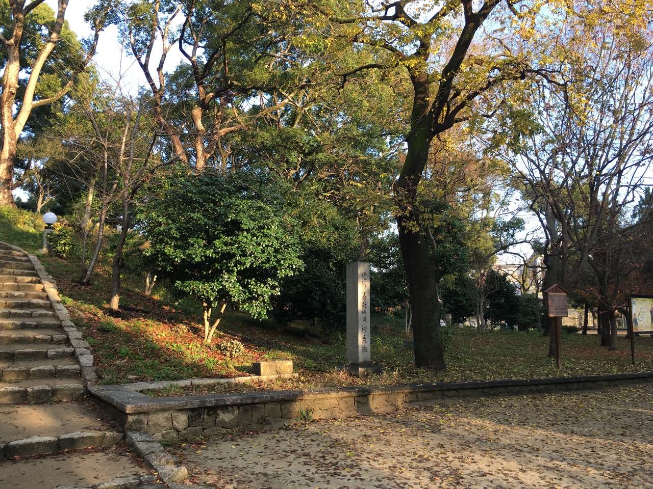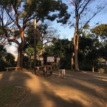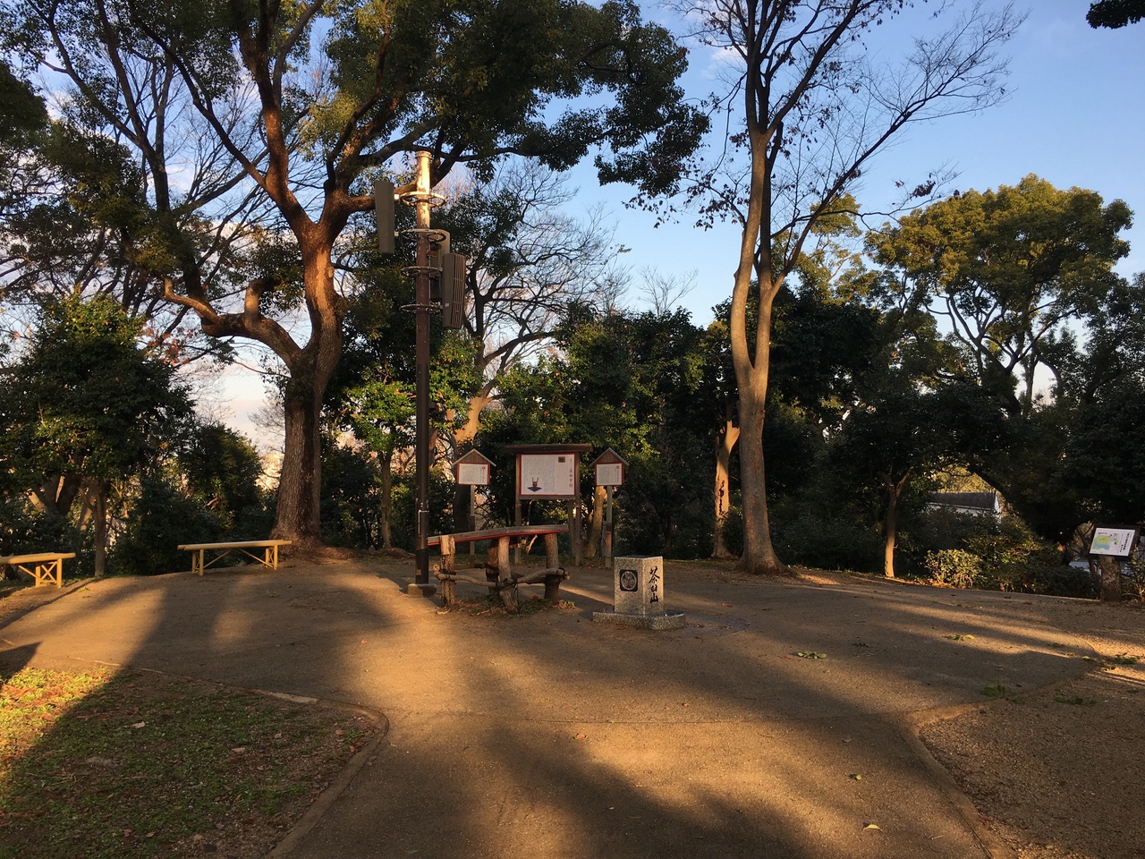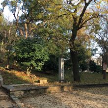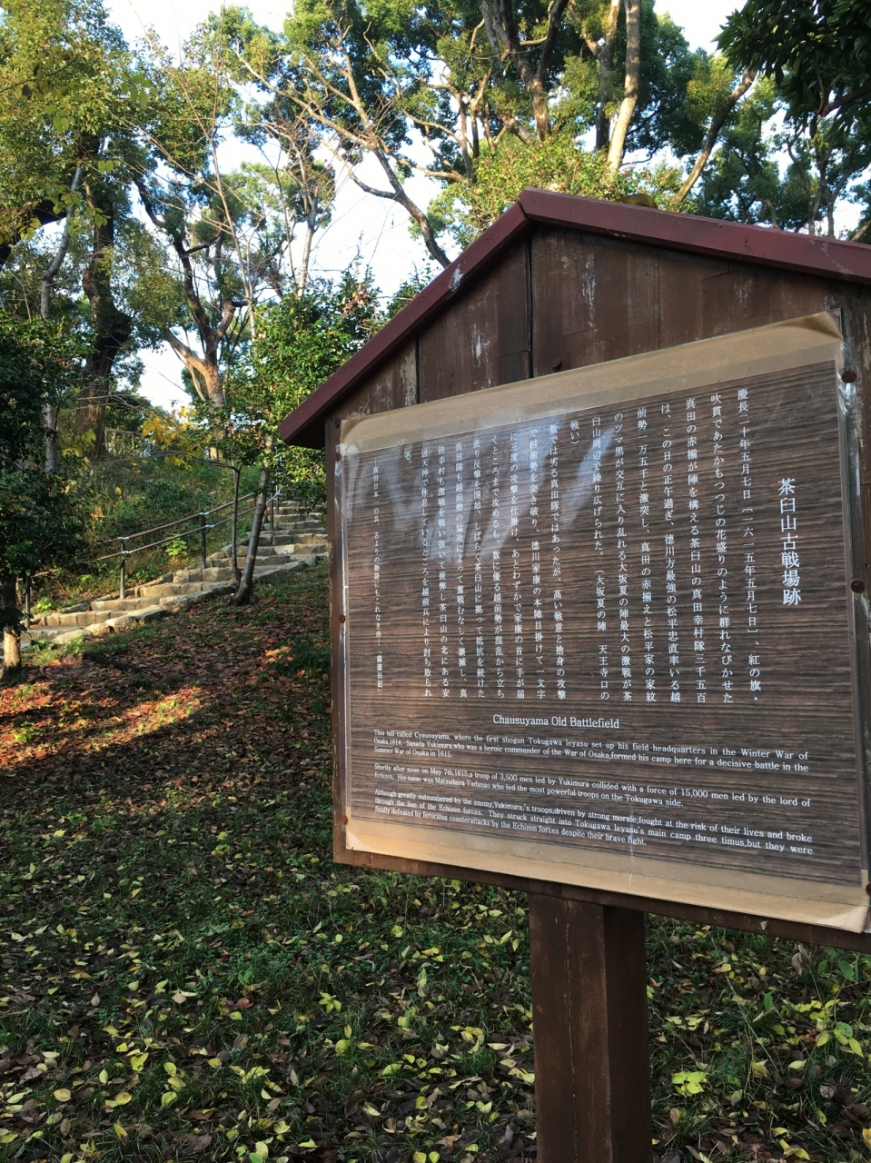 なだらかな丘になっている昔の古墳です。大阪の陣の時には本陣があったようですが、この高さだと遠くを見渡せるのか、疑問に思えました。頂上は平らになっていて、真田幸村のことを書いた看板がありました。木が程良く生えていました。
