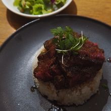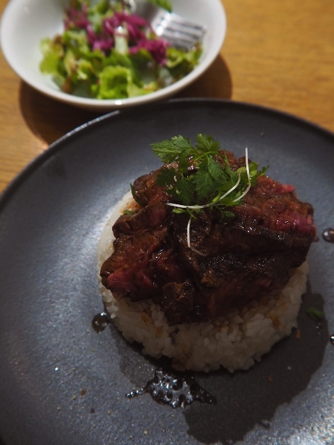 皿の上にライスを半球状に盛り、タレを掛け、ローストビーフのスライスをこれでもか、とトッピング。肉とライスという、シンプルな料理。