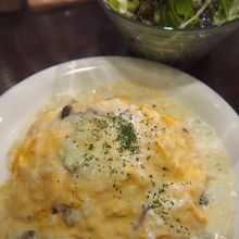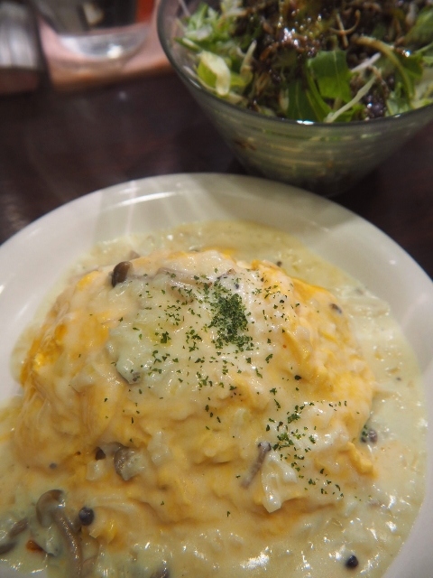 また、メインのオムライスも、サラダに負けずボリューミーなもの。オムライスというと、最近は卵等原材料が高騰しているからか小振りなのが多くなってしまったが、当店のオムライスは一体卵をいくつ使っているのか、と心配してしまうサイズ。クリーミーなホワイトソースも、オムライスの周りにたっぷり掛けてあった。中は、ケチャップがベースのチキンライス。