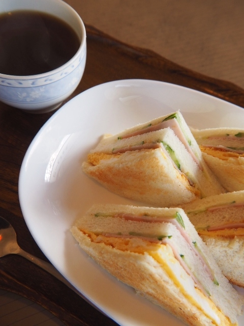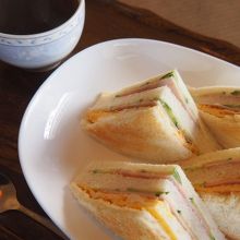 ハムとキュウリのサンドウィッチと、玉子とハムとレタスのサンドウィッチから成り立っており、4切れにカットされた状態で提供された。