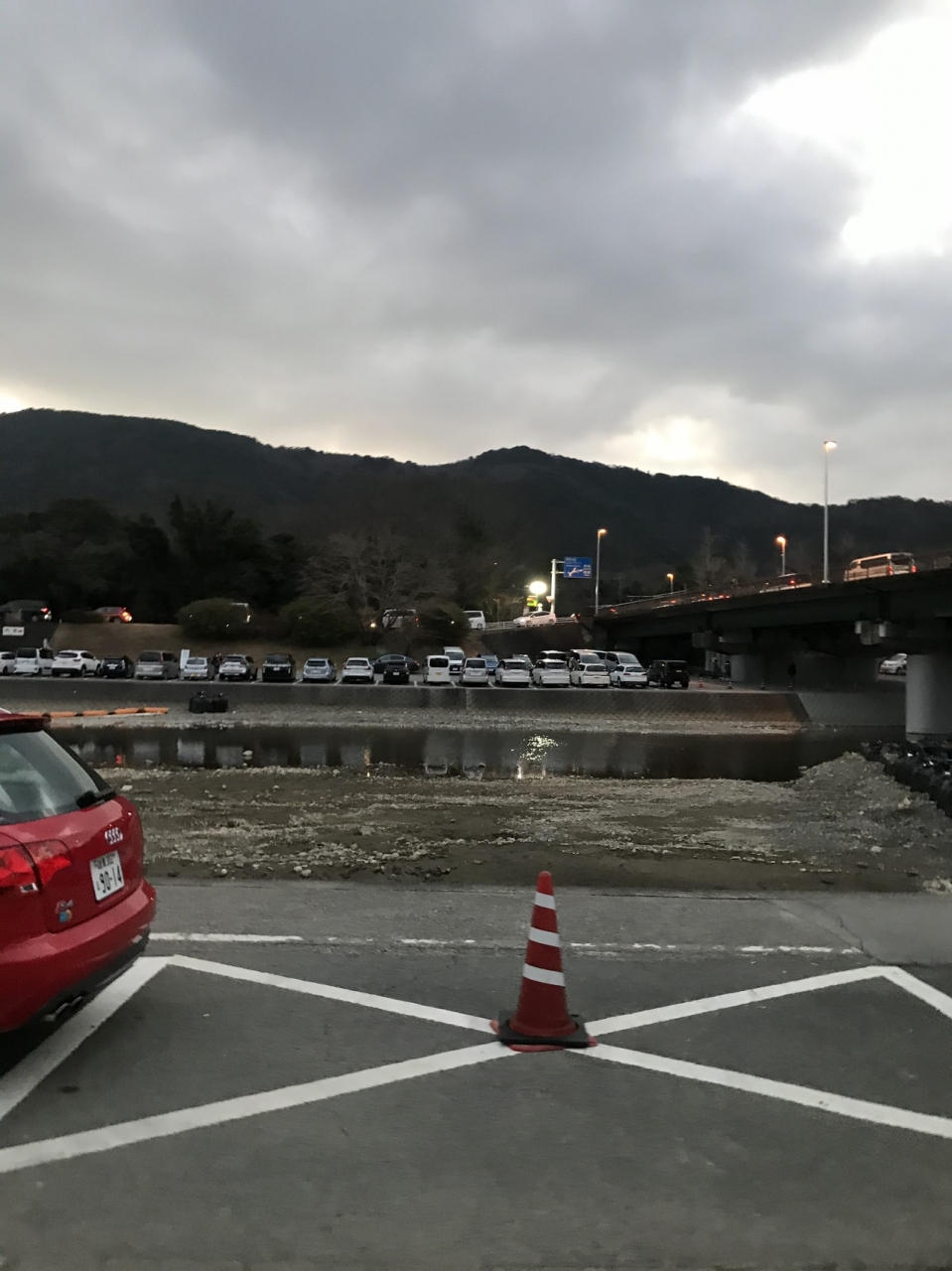 平面駐車場は満車なので、川沿いの駐車場に駐車。朝ごはんを車中で済ましている間にも、続々と車が来ます。遠い他県のナンバーも、たくさん見かけました。