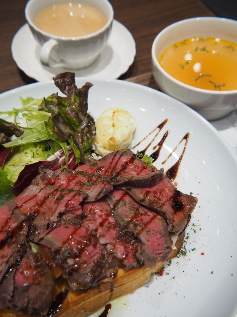分厚いトーストに、レタス、トマト、そしてローストビーフをトッピングしている。バルサミコ酢ベースのソースを掛け、赤ペッパーをまぶしている。
