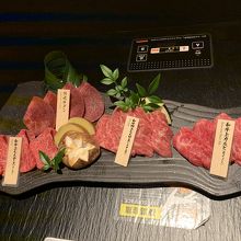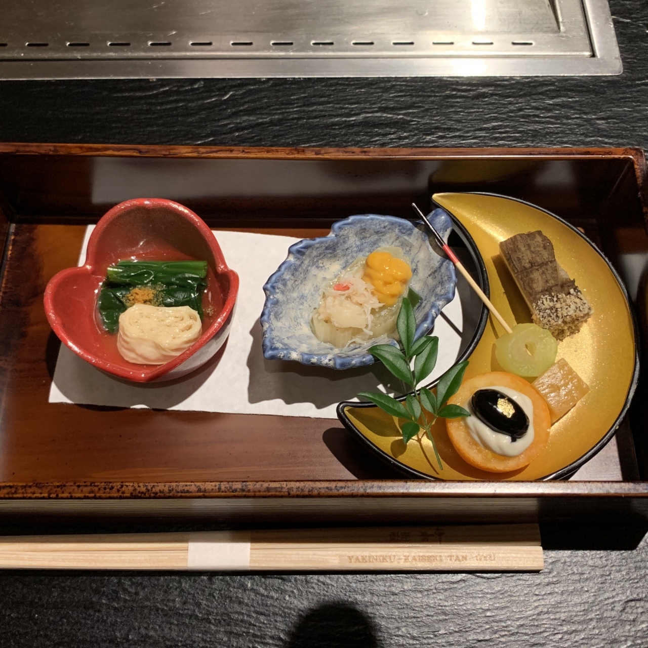 前菜、サラダ、上和牛3種と熟成牛タン 、ご飯、デザート