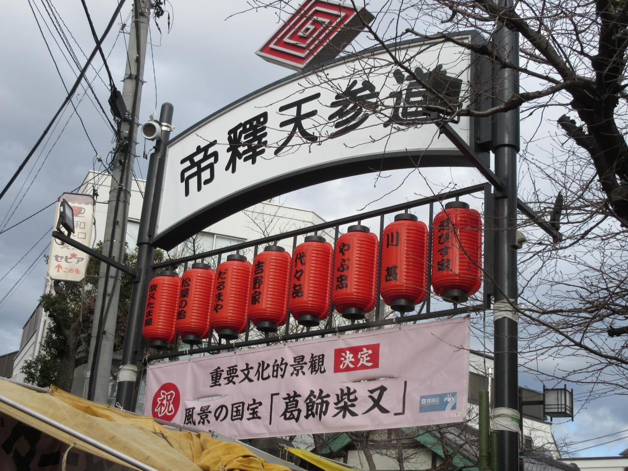 柴又駅から題経寺(帝釈天)までの参道。さほど距離はありませんが昭和の雰囲気は感じます。普段はわかりませんが、初詣のひとでいっぱいでした。最近は食べ歩きに関して控える商店街もありますが、こちらお団子やせんべいのお店では、食べ歩き用も売っていました。