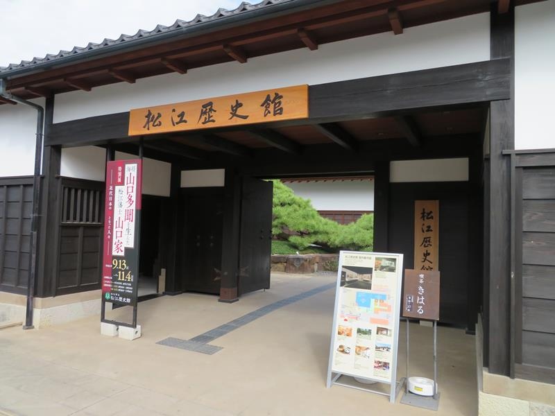 松江城の東側の内堀端、北惣門橋のすぐ近くにある武家屋敷風の建物になっています。