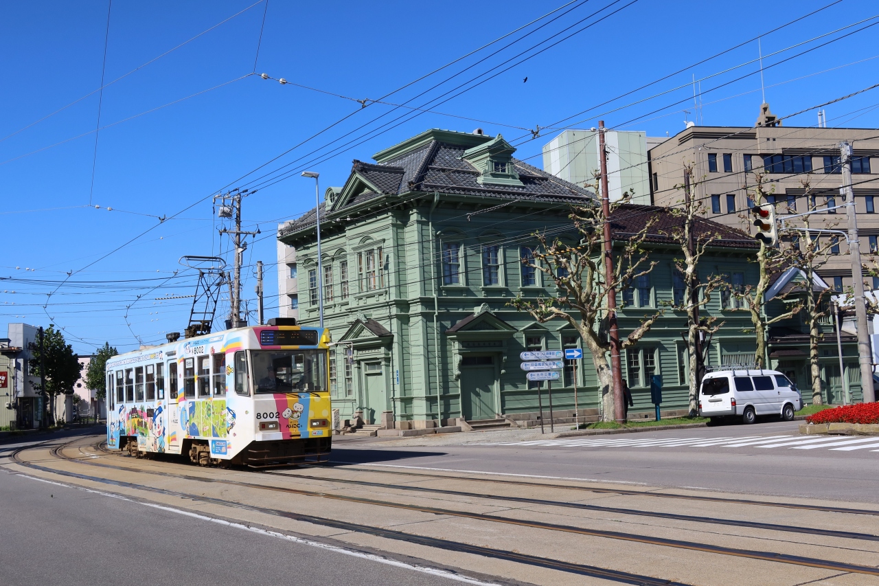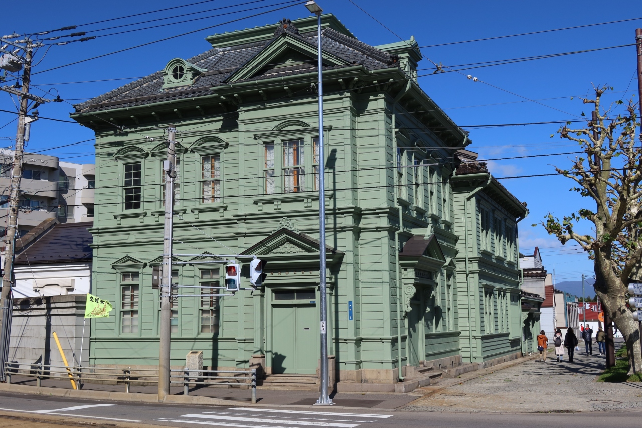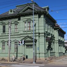 函館の基坂を下った市電が走る交差点の北西角にあるモスグリーン色をした建物が相馬株式会社の本社です。1916年に建てられた木造2階建ての建物は寄棟、切妻が複雑に組み合わされており、屋根につけられたドーマー窓や、窓の形も良く見ると1階と2階で庇の形が異なるなど凝った造りになっています。