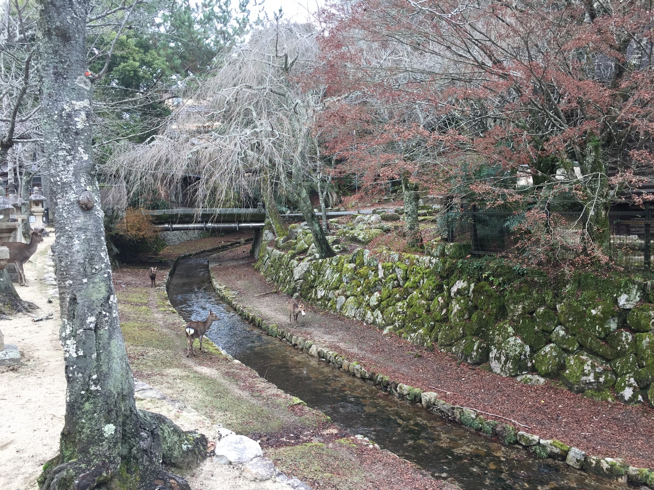 世界遺産の厳島神社はもちろん、自然と一体化した風景が魅力。島の観光エリアにはあちこちに鹿がいます。野生の鹿ながら基本的に攻撃的ではないものの、目の前でなにかを食べたりビニール袋の音をさせていると、エサだと勘違いして食いついてくるので注意。
