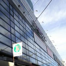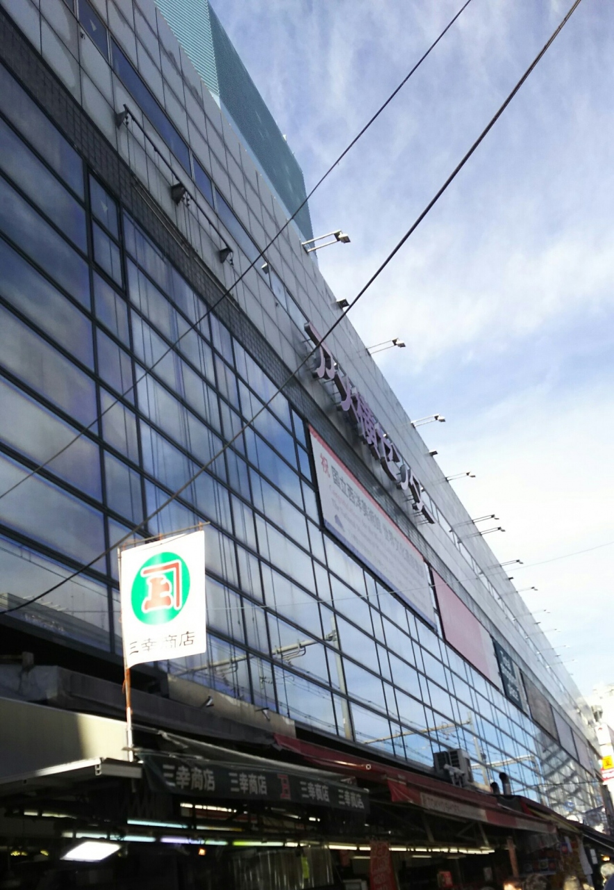 アメ横入り口にあるビルです。上野側にあります。鏡のような窓があるビルで、一階ではアメ横の商店街に面している店舗が元気よく営業しています。