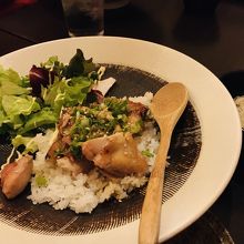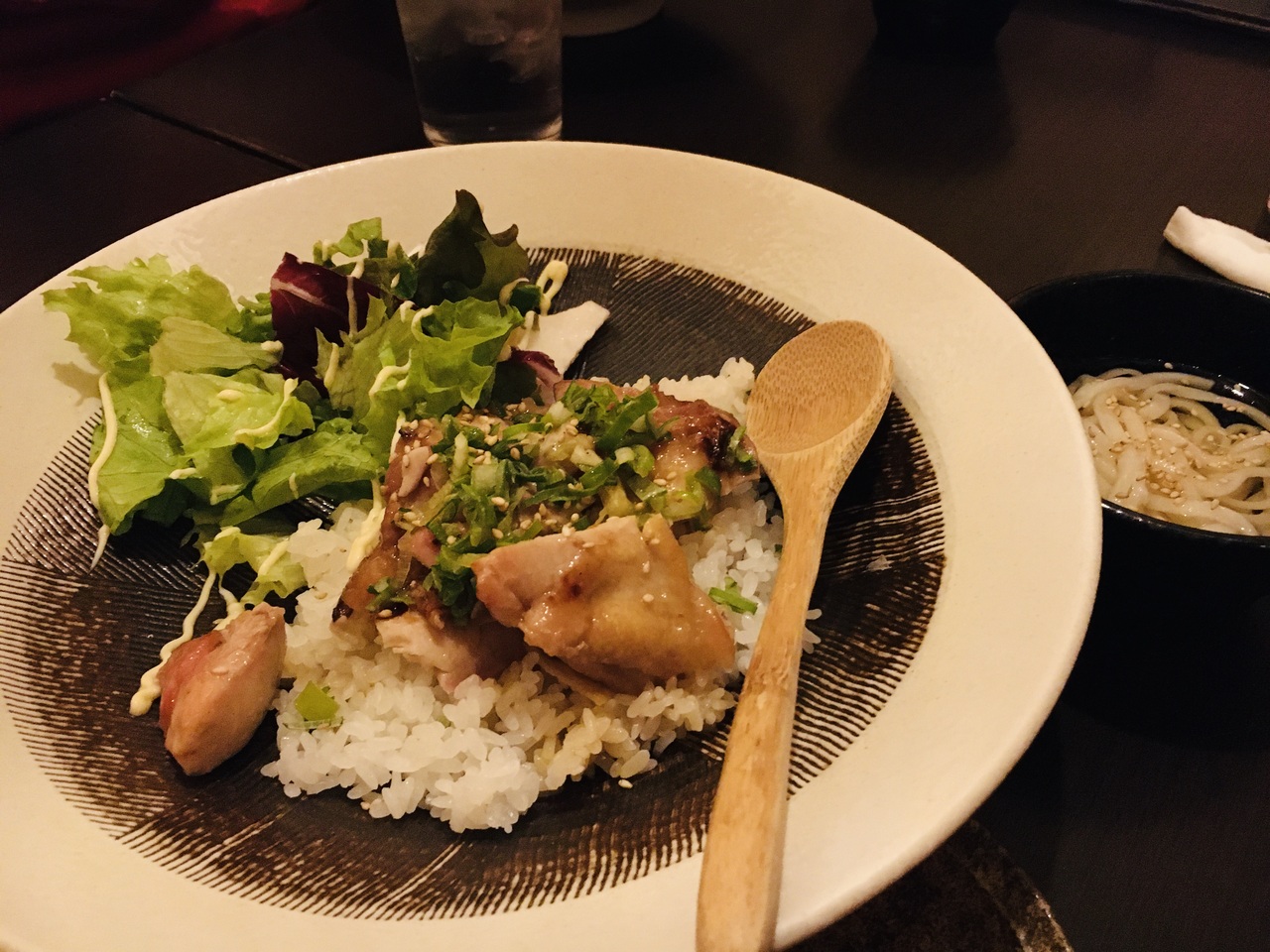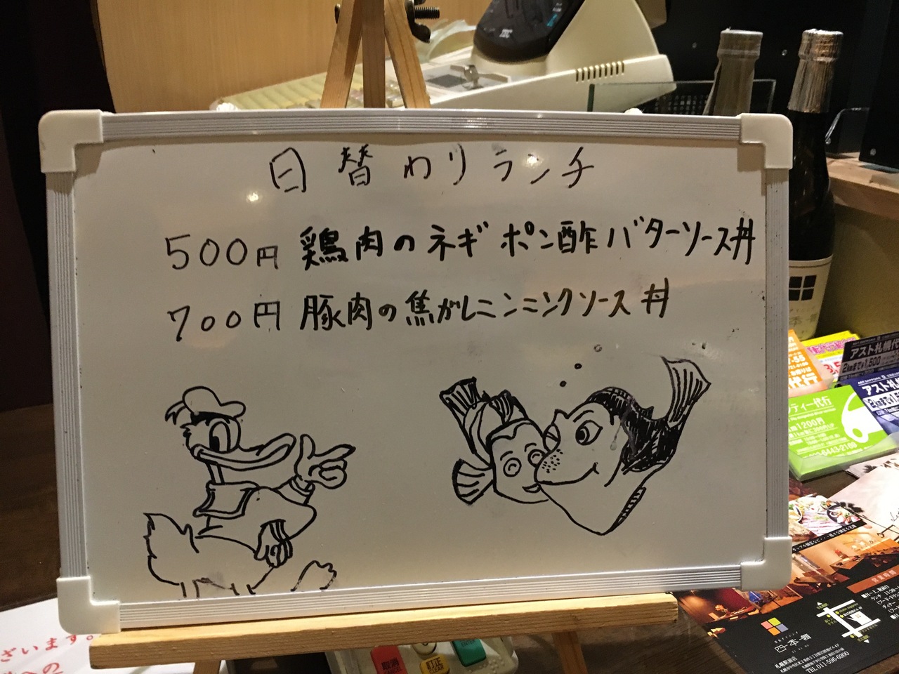 地下道に直結していないので、いちど外に出てからビルに入る必要がありますが、そのせいかワンコインランチをやっていてとってもお得です。私たちが行ったときにはバタぽんチキン丼とうどん付きで、のうどんがとってもコシがあって美味しかったです。夜は居酒屋のようですが個室で食べれたので落ち着けました。