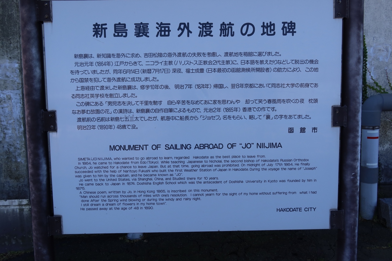 函館の東坂を下り函館港に突き当たった公海食品の倉庫の横に新島襄海外渡航の地碑が建立されています。同志社大学を創立した新島襄が1864年にこの場所からアメリカ商船ベルリン号に乗り込み脱国した場所が函館港に面したこの場所です。
