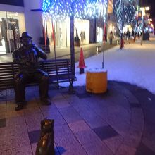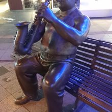旭川の平和通買物公園にある彫刻です。買物公園は、彫刻が多いのですが、その中でも、ひときわ市民や観光客に親しまれている彫刻です。冬でも、サキソフォンを吹くおじさんの横に座り、記念写真を撮っている人が多いです。いつまでもお元気で。ネコちゃんも、カゼをひかない様にねと語りかけてしまいます。
