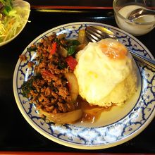 ガパオを注文しました。ランチだったのでスープやサラダがついてきましたが、スープが今まで食べたことがない不思議な味がしました。ガパオはそれなりにピリ辛で、辛いものが苦手な人はおさえめにしてもらった方がよいかもしれません。