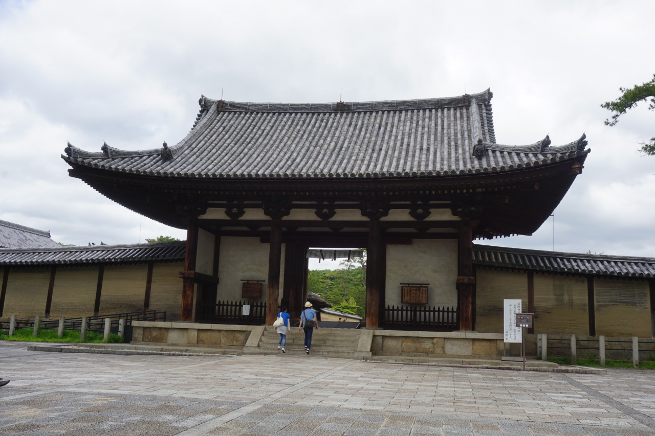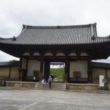 法隆寺の南大門は、法隆寺の玄関。参道である松の並木を進むとこの門にたどり着きます。一段高いところに構えた門は、八脚門。柱は12本ですが、通常の門としての左右の2本の柱を除いて前に4本、後ろに4本の8本の控柱があるので八脚門。現在の門は、1439年(永享11年)の再建。南大門は穏やかな印象ですが、一方で、ここから見ると、左右に頑丈な土塀がはるかに伸びていて、印象は一転。塀の構えの雄大さも必見でしょう。